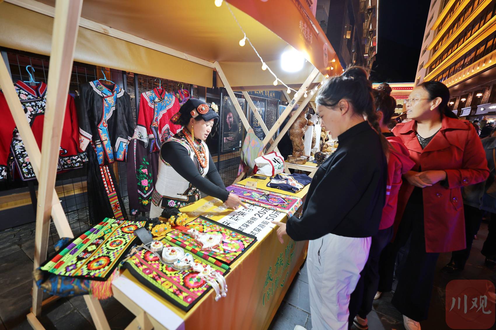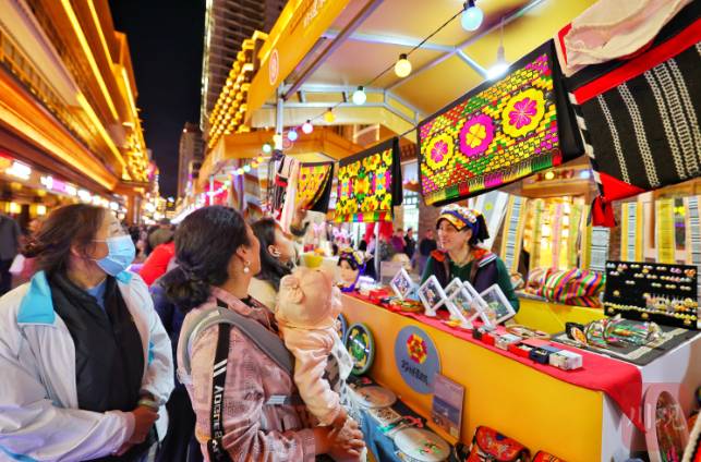 来自九寨沟县的马迎庆在集市里挑选着羌绣。“从来没有逛过这么大规模的非遗集市,刚刚买了羌绣挂件,又想买一个文创产品。”马迎庆说,她还带着家人一起体验了藏羌银饰锻造技艺、唐卡、藏文书法等非遗项目。