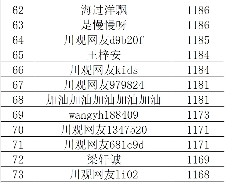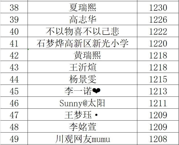 截至9月15日下午6点,排名前三的市州分别为达州市、资阳市和雅安市,宣汉县、宝兴县和蓬安县进入区县排行榜前三名,姚柯妙、刘珏萌、刘洛皙、蒲相宇小朋友位列个人排行榜前四位。