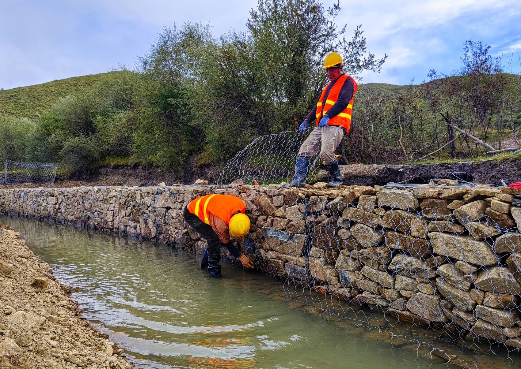 白河支流阿木柯河,施工员正在进行石笼施工。