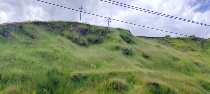 红原县邛溪镇一处废弃工矿取料点,经过几十年取料,崖壁裸露,风一刮,满山泥灰。而今近乎垂直的陡立坡面已经长出草籽,仿佛铺上了一层“绿地毯”。