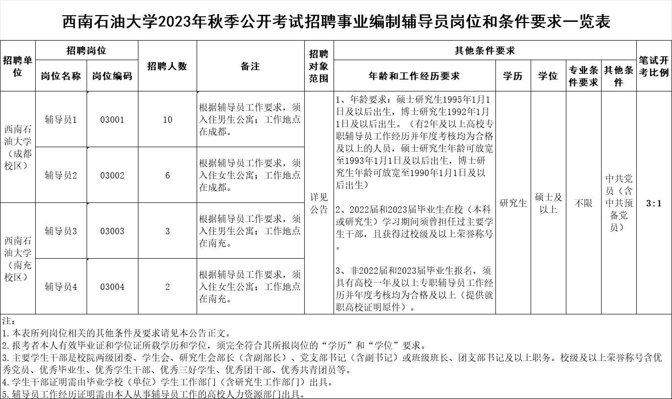 招聘详情请登录四川省人力资源和社会保障厅官网“人事考试”专栏查看《西南石油大学2023年秋季公开考试招聘事业编制辅导员公告》。