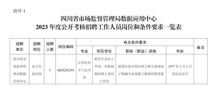 招聘详情请登录四川省人力资源和社会保障厅官网“人事考试”专栏查看《四川省市场监督管理局数据应用中心2023年度公开考核招聘工作人员公告》。