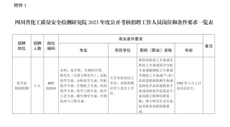 招聘详情请登录四川省人力资源和社会保障厅官网“人事考试”专栏查看《四川省化工质量安全检测研究院2023年度公开考核招聘工作人员公告》。