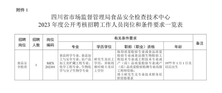 招聘详情请登录四川省人力资源和社会保障厅官网“人事考试”专栏查看《四川省市场监督管理局食品安全检查技术中心2023年度公开考核招聘工作人员公告》。