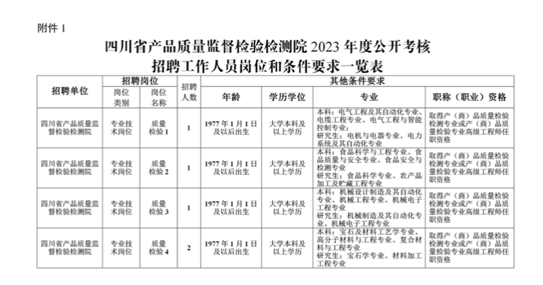 招聘详情请登录四川省人力资源和社会保障厅官网“人事考试”专栏查看《四川省产品质量监督检验检测院2023年度公开考核招聘工作人员公告》。