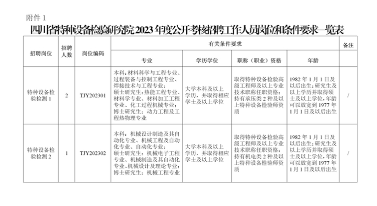 招聘详情请登录四川省人力资源和社会保障厅官网“人事考试”专栏查看《四川省特种设备检验研究院2023年度公开考核招聘工作人员公告》。