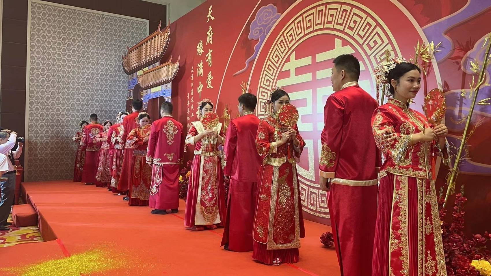 婚礼现场,喜庆庄重、简约温馨、隆重热烈,新人代表们身穿红色中式礼服、凤冠霞帔,在背景墙写下一生的誓言,留下专属的幸福合影,走上象征美满婚姻的红地毯。为展示传统文化特点,活动主办方还精心设计了雀扇礼、交换婚书、合卺礼等中式婚礼仪式,让新人们在沉浸式文化体验中镌刻难忘回忆。