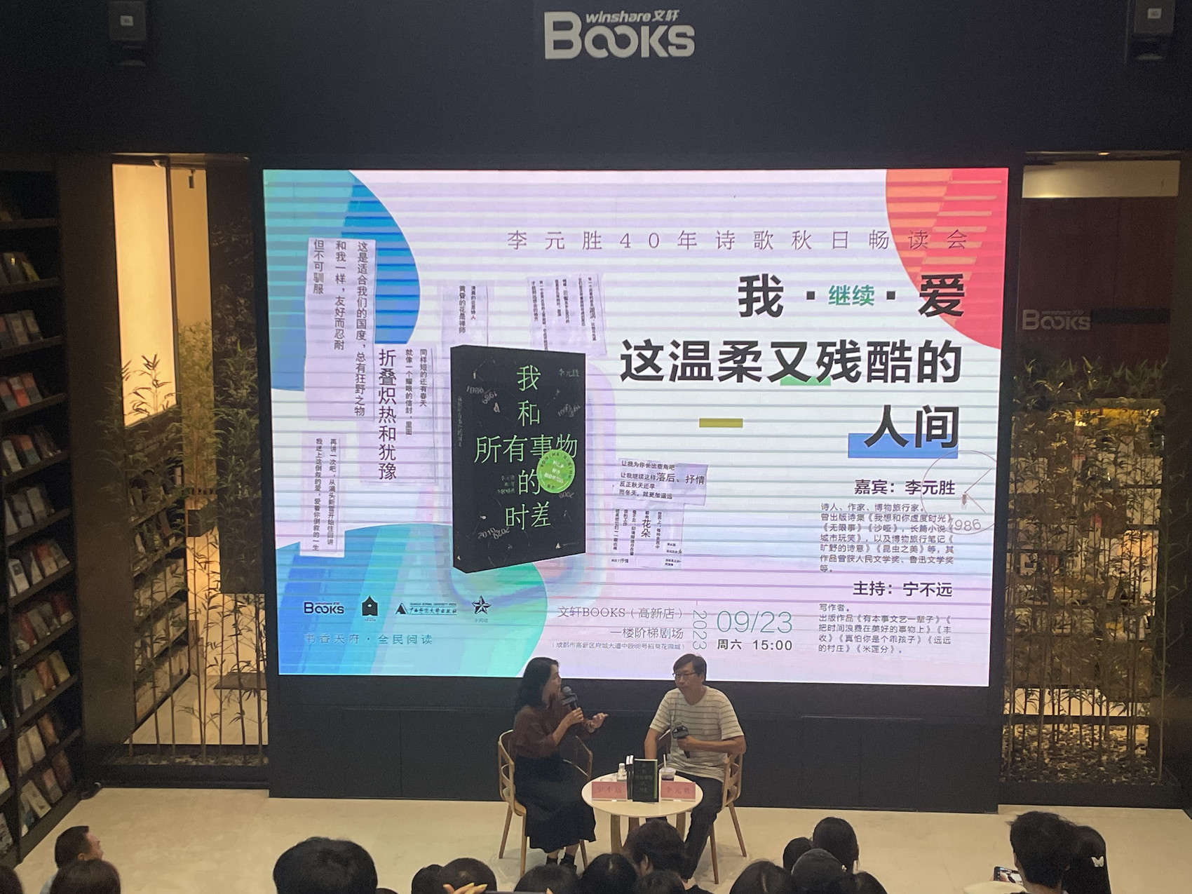 当一个人持续40年做一件事,他会有怎样的思考和认知?他又将有哪些心得体会想要分享给后来者?9月23日,“鲁奖”诗人李元胜携他的40年诗歌精选集《我和所有事物的时差》到成都分享。围绕“我继续爱这温柔又残酷的人间”这一主题,李元胜回首自己40年的诗歌创作经历,并就诗歌创作、阅读与评判等众多问题与现场观众互动。