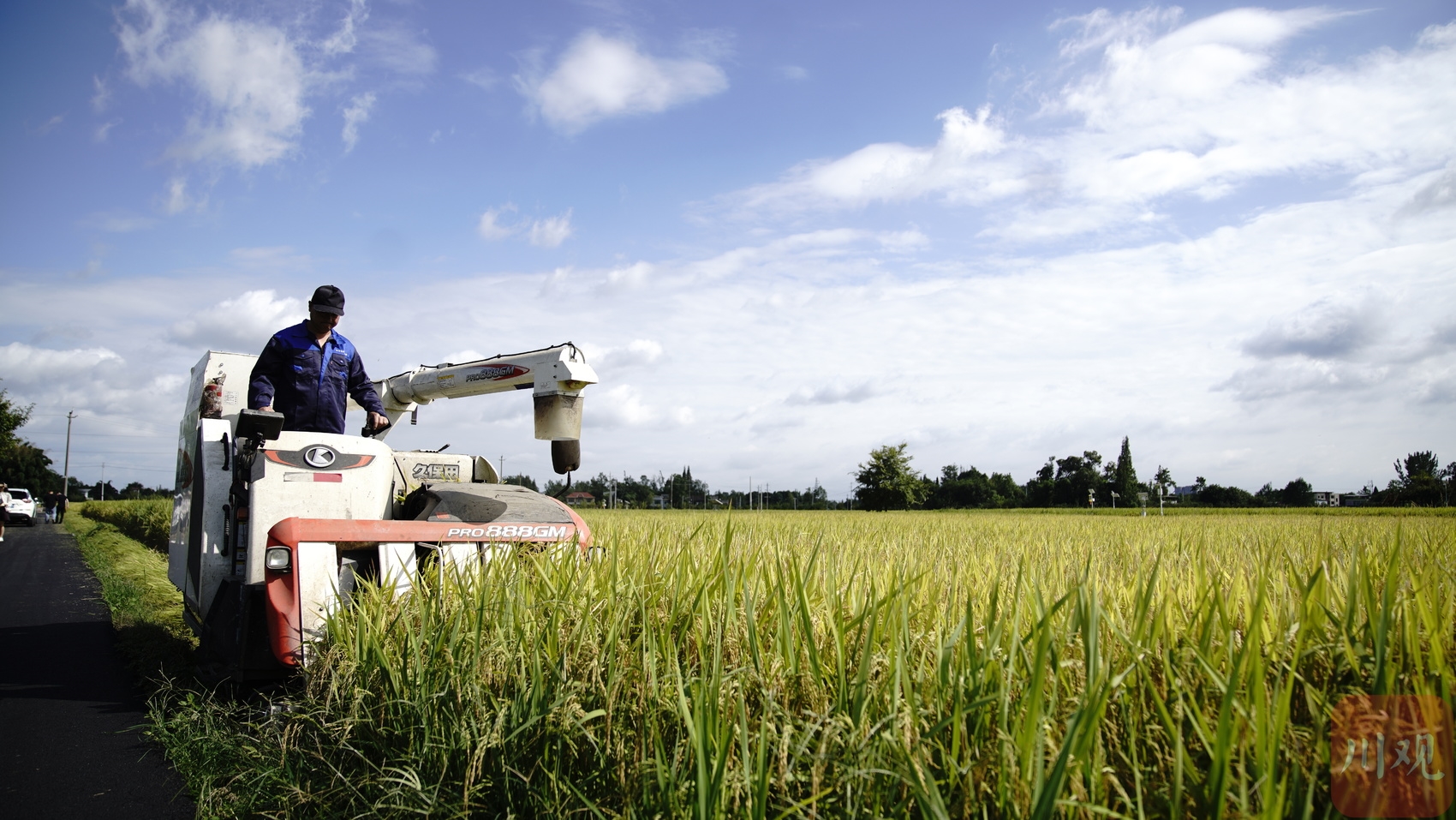 时节入秋,香城新都,阡陌良田土膏正润,微风吹绿五谷生长,香城大地也迎来了新一季的收获。伴随着收割机隆隆的运作声,身着蓝色工服,头戴棕叶草帽,新都区昌平农机作业专业合作社管理人员陈道松手操方向盘,熟练地驾驶着联合收割机在金色的稻田里来回穿梭。