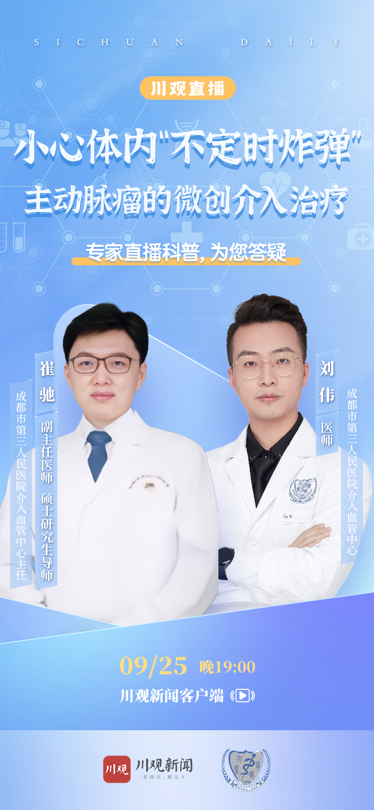 9月25日,川观新闻联合成都市第三人民医院,就主动脉瘤的正确认识,微创介入治疗进行科普讲解,给出科学、实用的指导意见,为您答疑解惑。