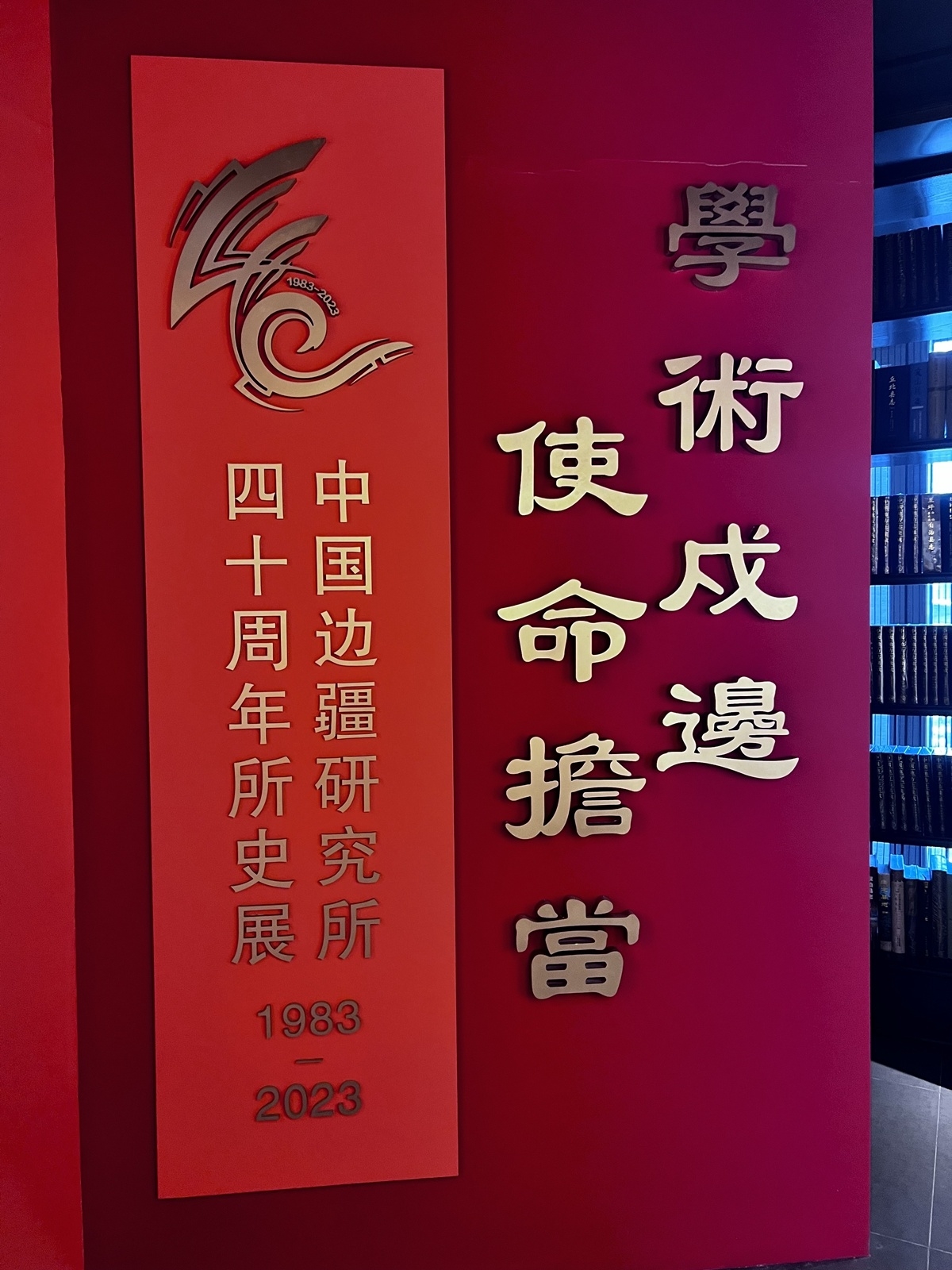 采访时,正值中国边疆研究所在筹备成立40周年所史展(1983—2023)。展厅入口处,是两排金色大字:“学术戍边”“使命担当”。