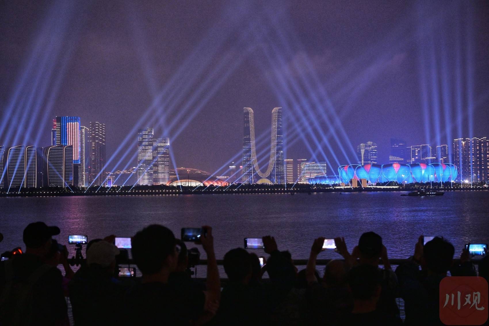 9月23日晚,杭州奥体中心场馆熠熠生辉,市民和游客们在钱塘江畔观看璀璨夺目的灯光秀。