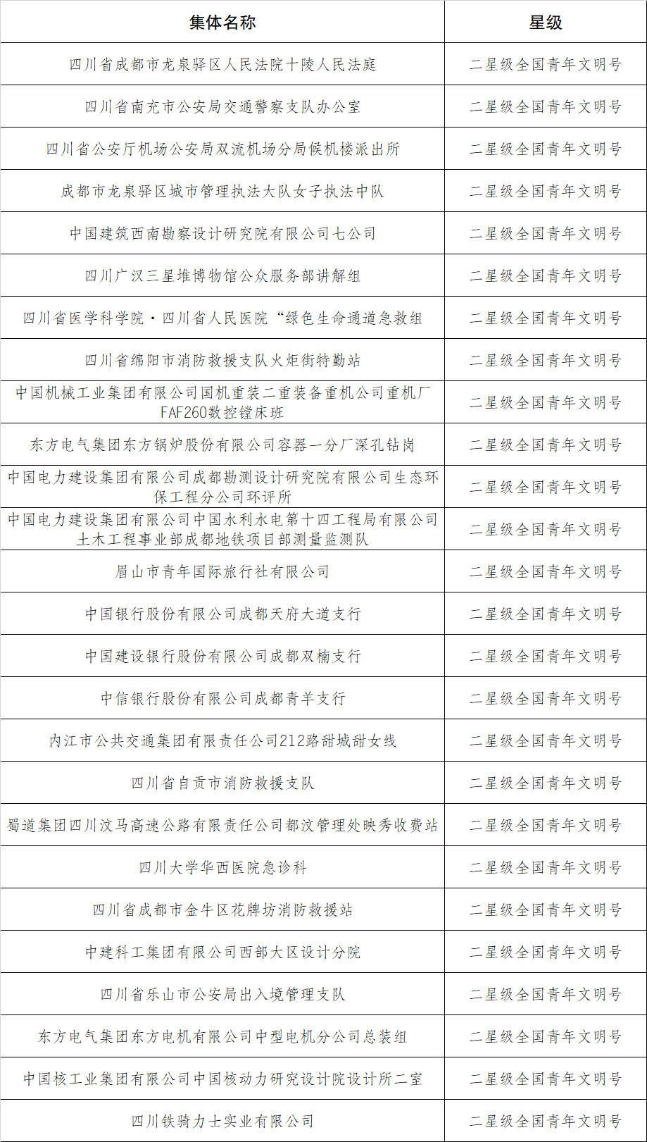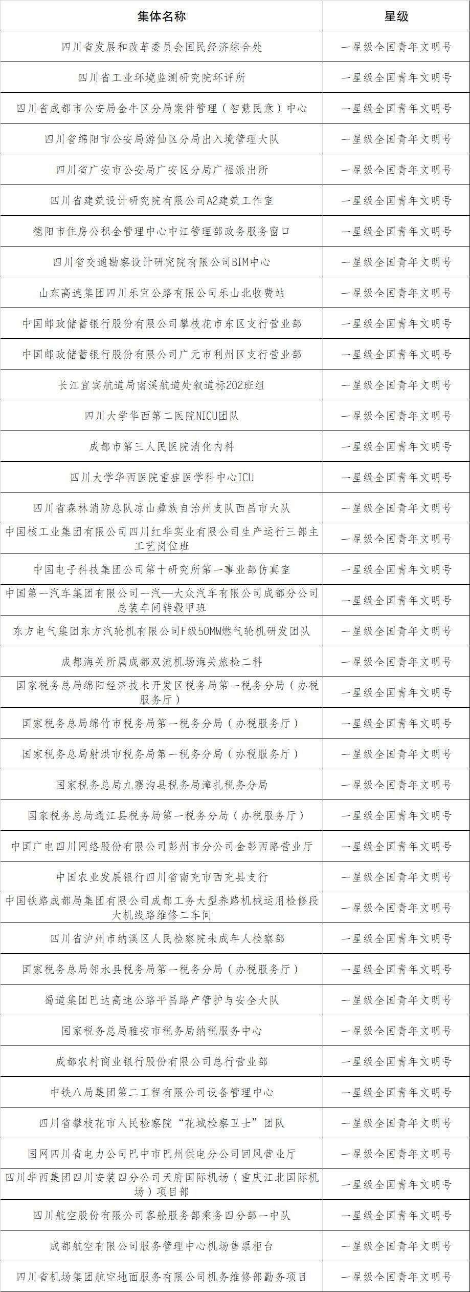 四川省乐山市公安局出入境管理支队、中建科工集团有限公司西部大区设计分院、东方电气集团东方电机有限公司中型电机分公司总装组等26个集体被命名为首批“二星级全国青年文明号”,国家税务总局雅安市税务局纳税服务中心、四川华西集团四川安装四分公司天府国际机场(重庆江北国际机场)项目部等41个集体被命名为“一星级全国青年文明号”。