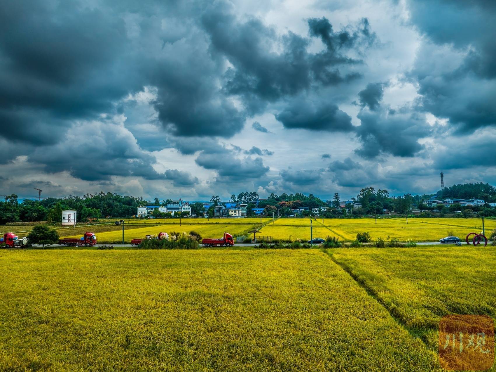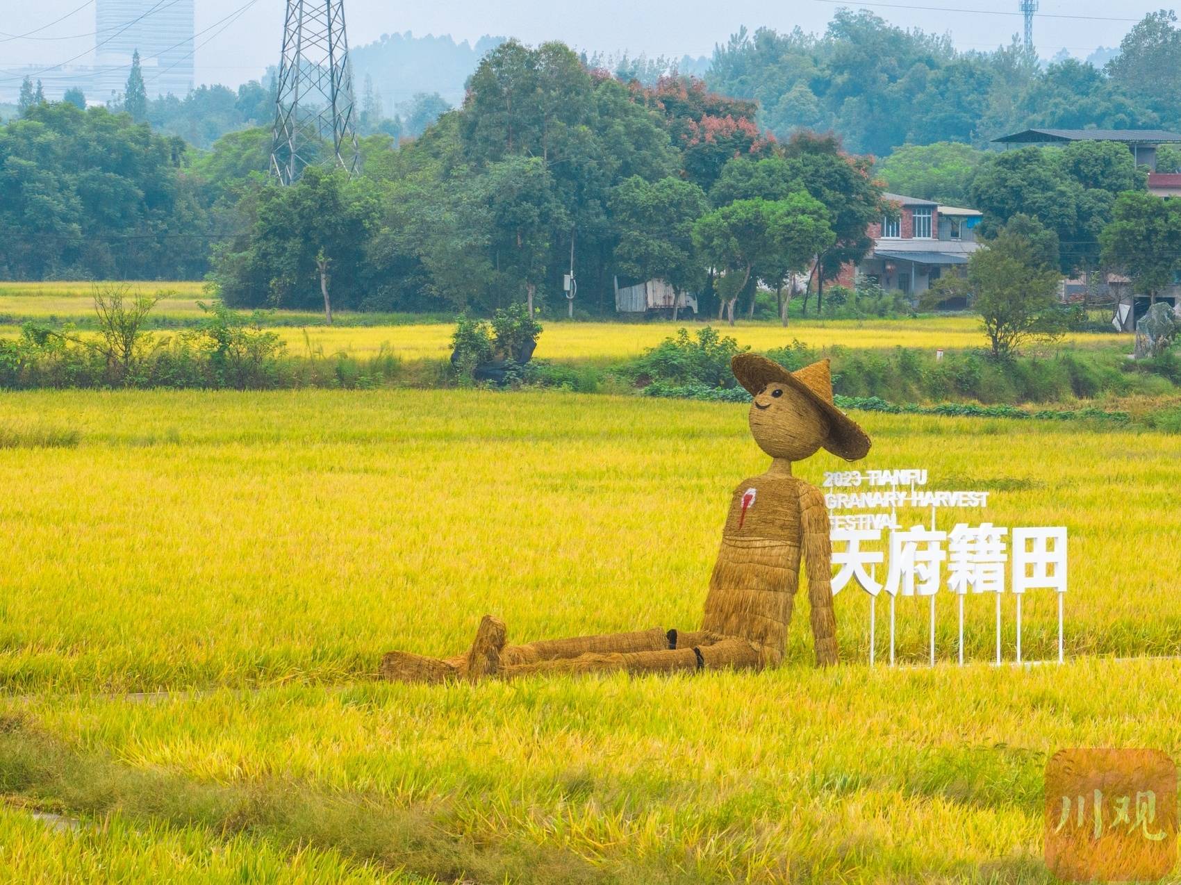 天府粮仓高标准粮油示范基地,金色田园中一个稻草人仰望天空,让人仿佛置身童话世界 。