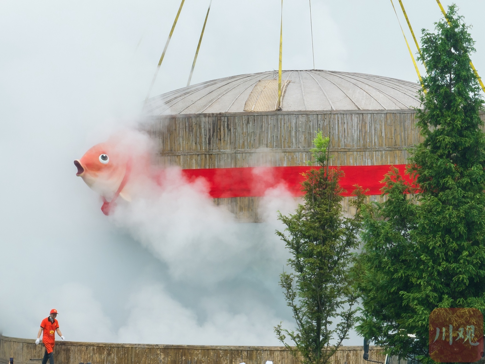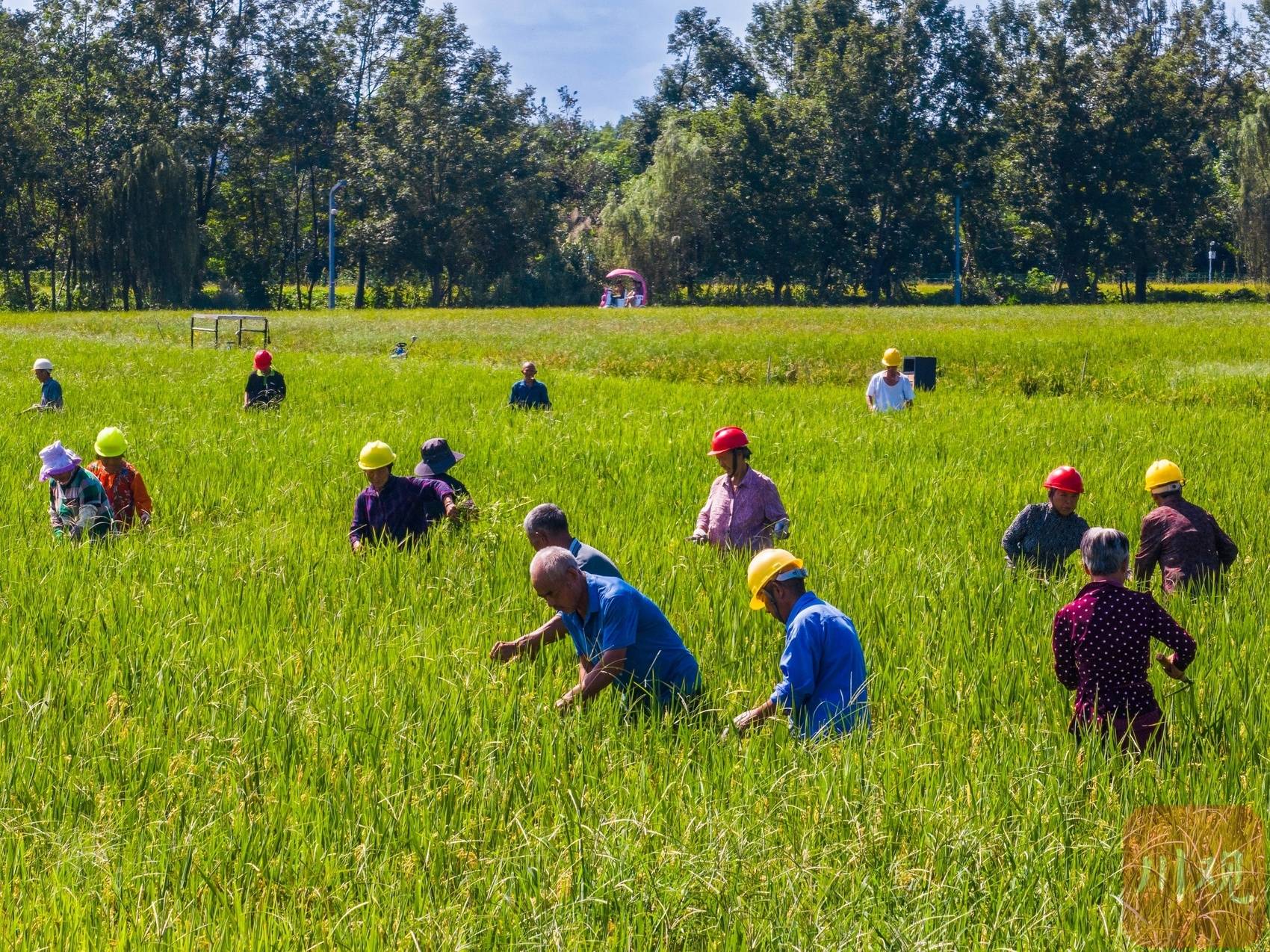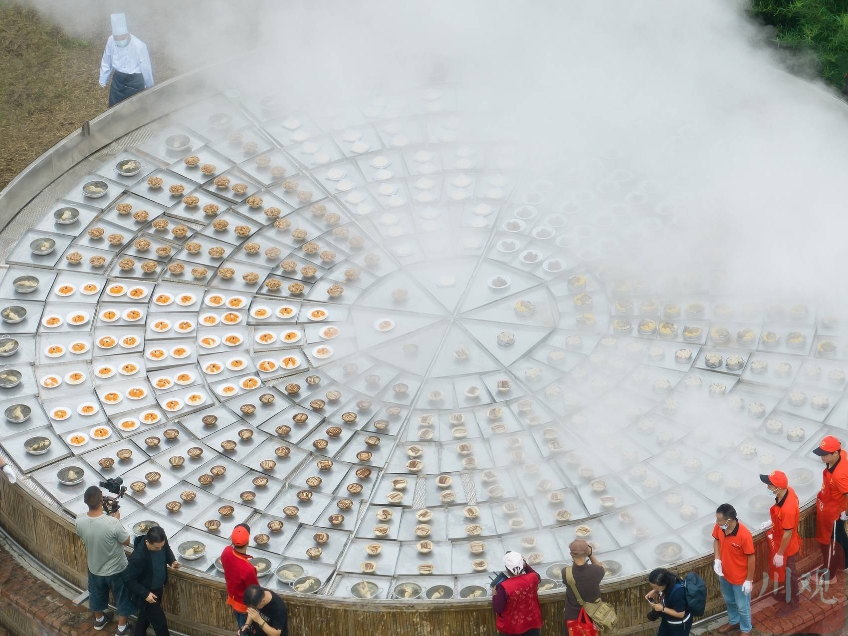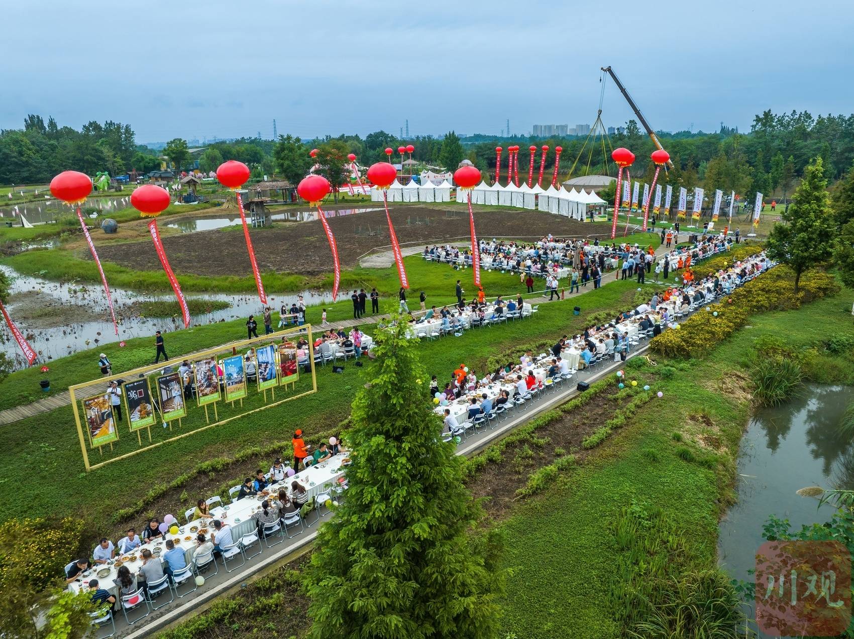 大邑县稻乡渔歌里,人们欢声笑语共享美食,享受丰收的美好。