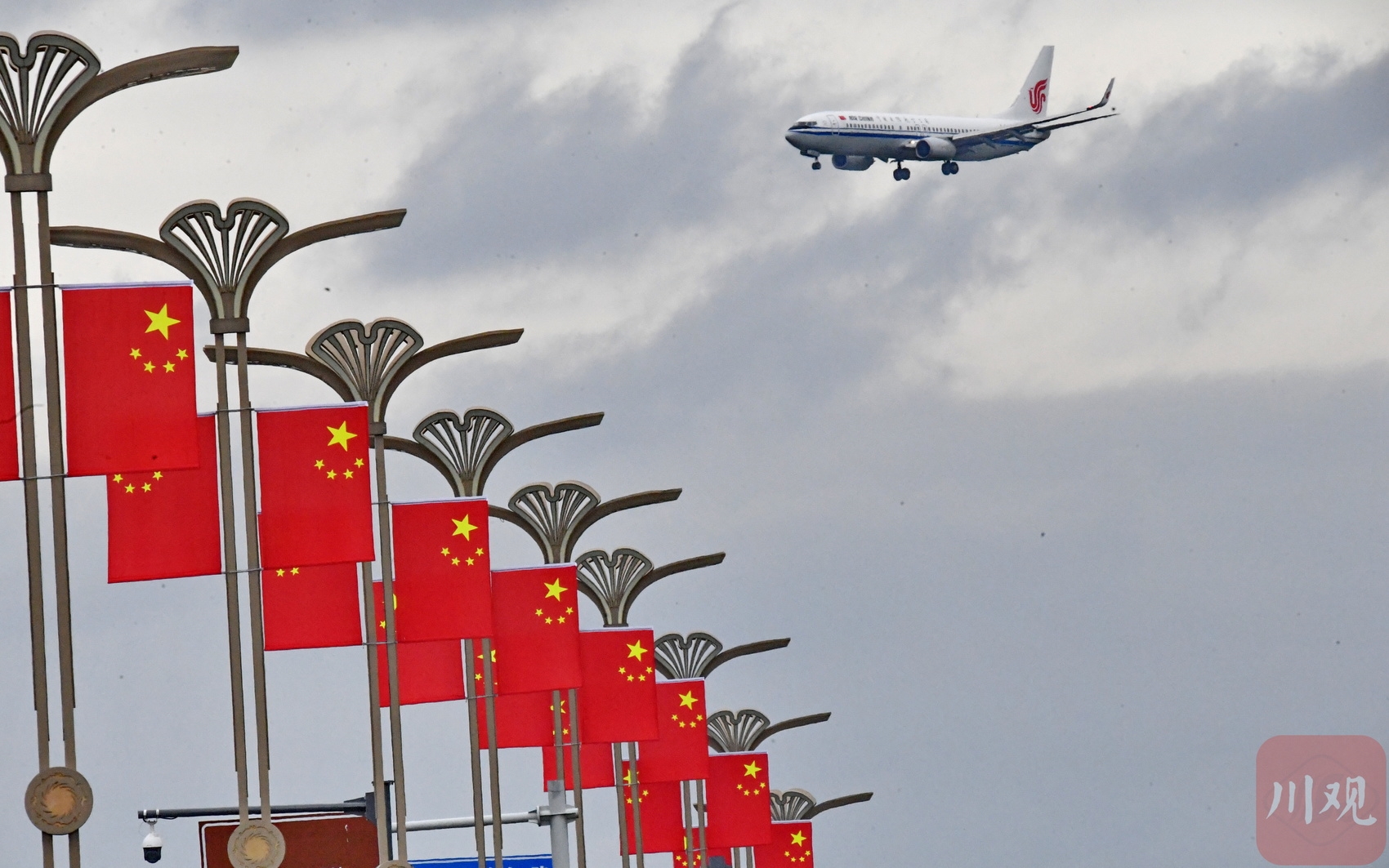 9月25日,飞机从挂满五星红旗的成都东部新区公园大街上空飞过。