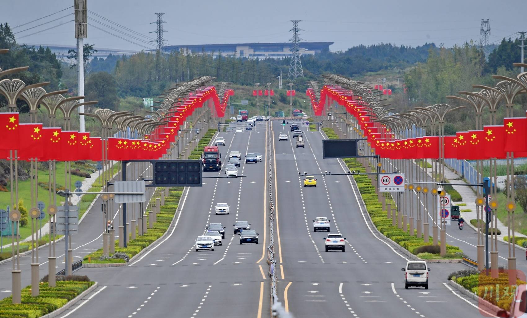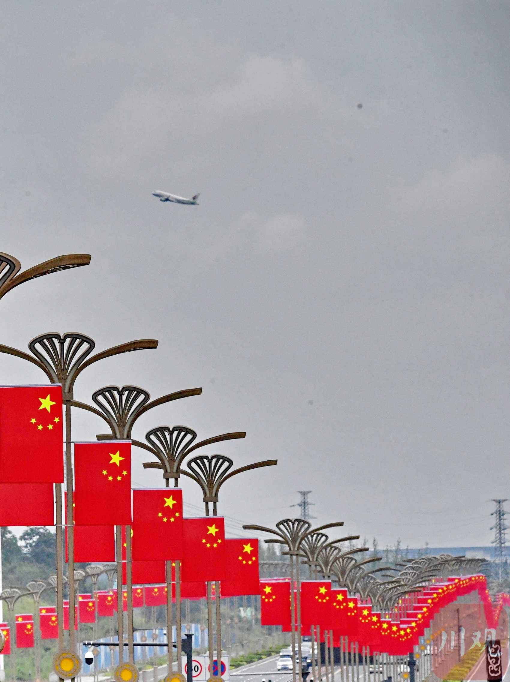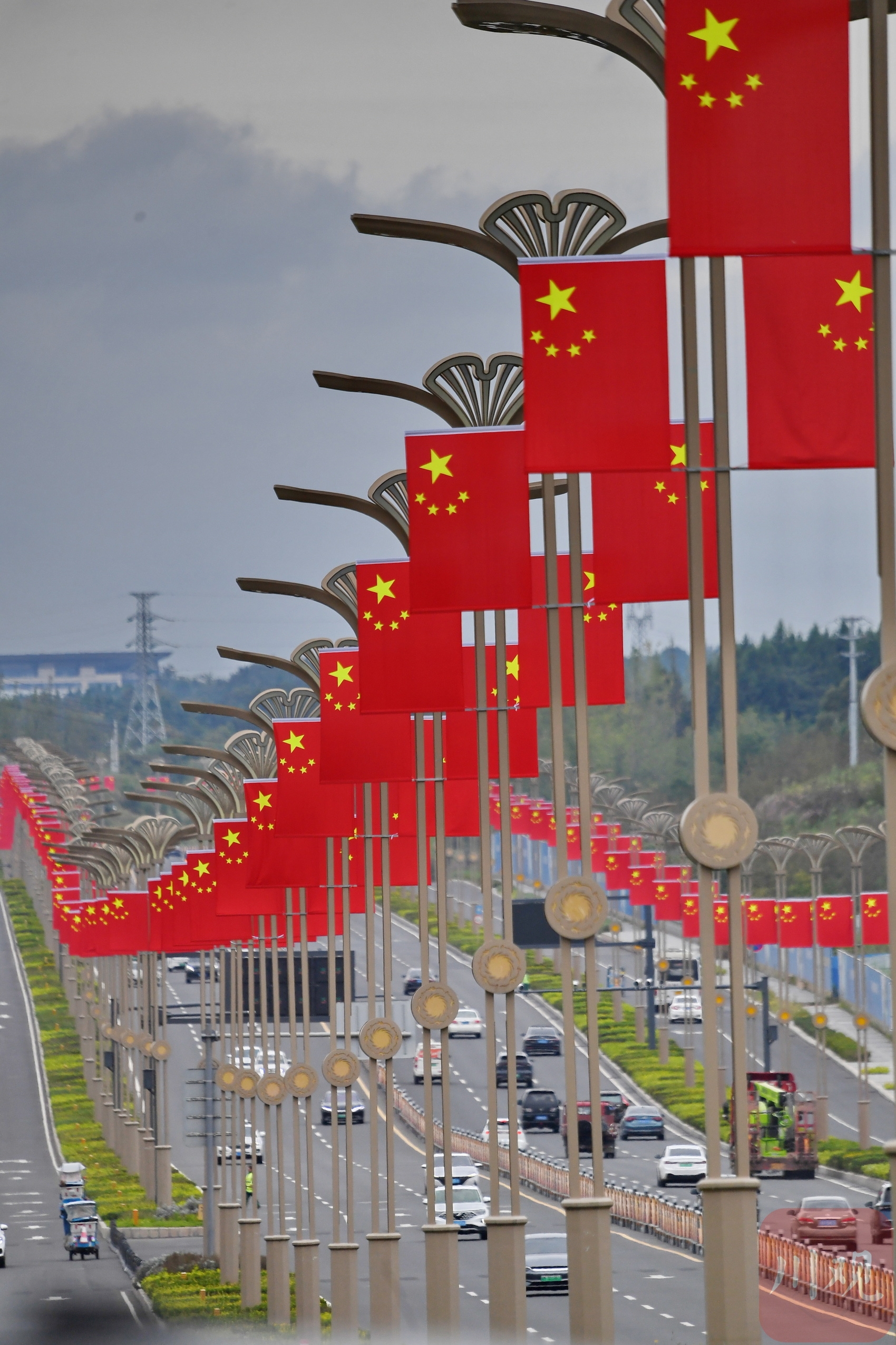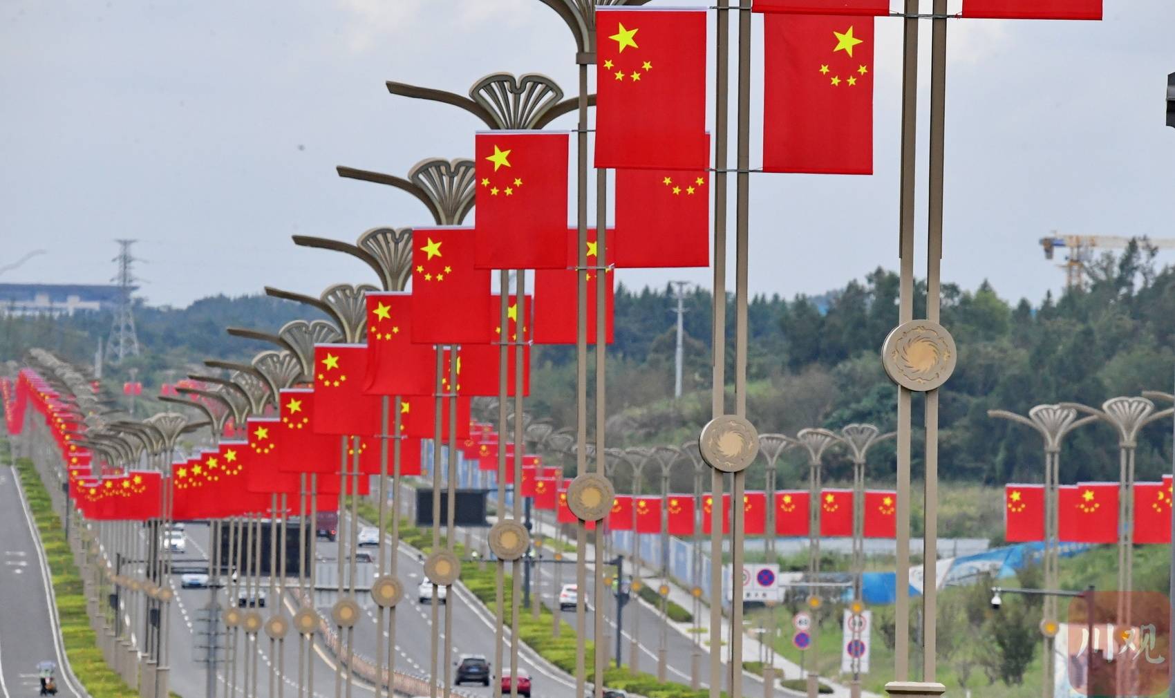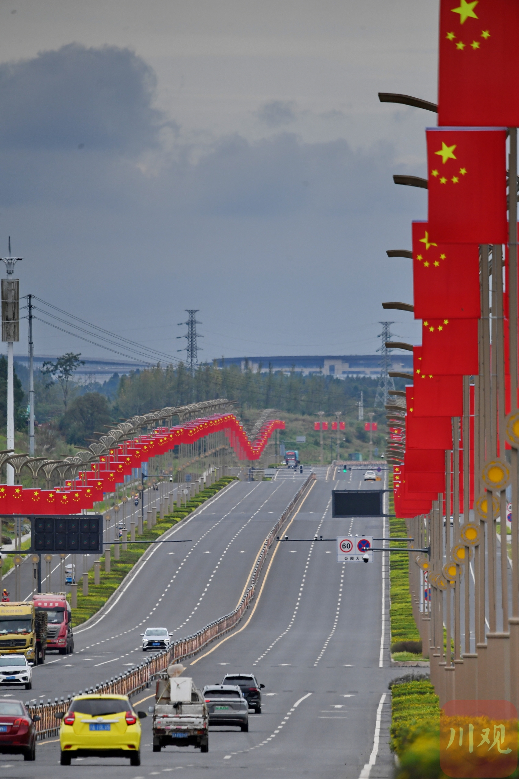 9月25日,成都东部新区公园大街、涟江大道、丹溪大道、贾家街道双湖路、天府国际机场附近等多条主街干道已挂满一排排“中国红”。