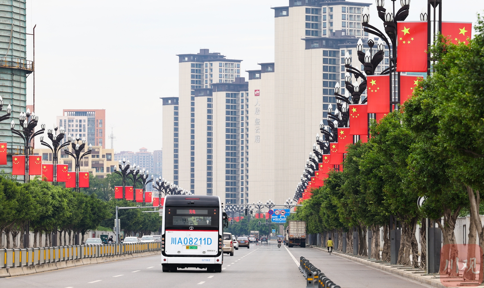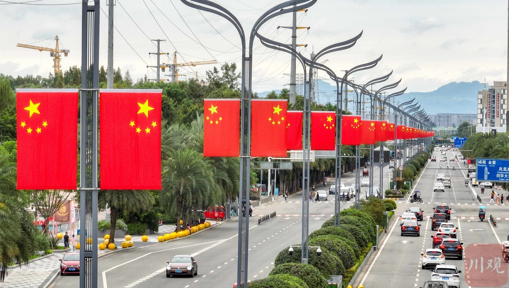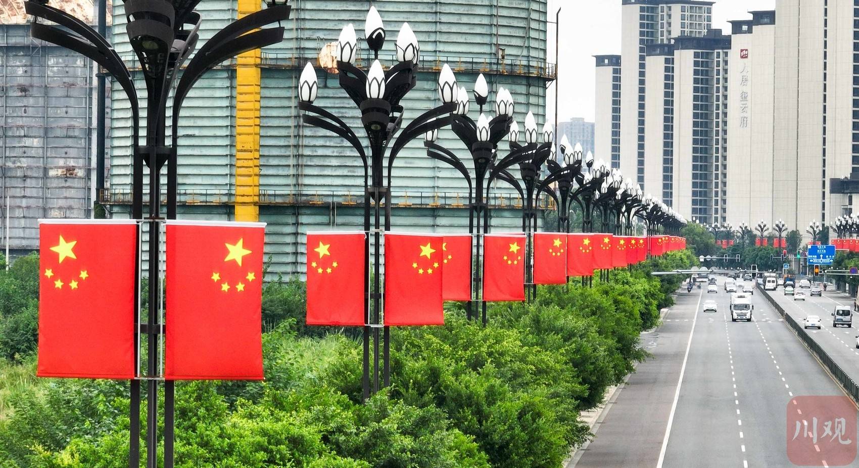 9月25日,随着国庆的临近,成都市青白江区主要街道挂起了一面面国旗,营造出浓浓的节日氛围。