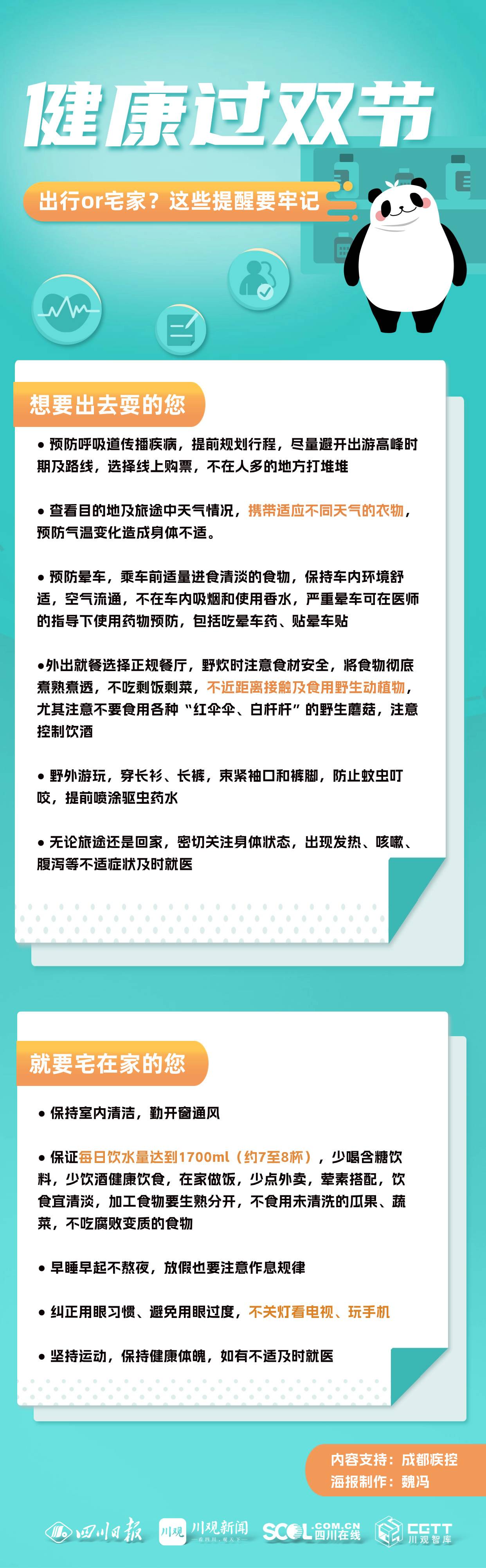 国庆中秋”双节“将至,8天的假期大家打算怎样度过?9月27日,成都疾控发出健康提示,提醒想出去耍的网友,预防呼吸道传播疾病,提前规划行程,尽量避开出游高峰时期及路线,不在人多的地方“打堆堆”。提醒宅在家的朋友们,保持室内清洁,勤开窗通风,保证每日饮水量达到1700ml(约7—8杯)等。