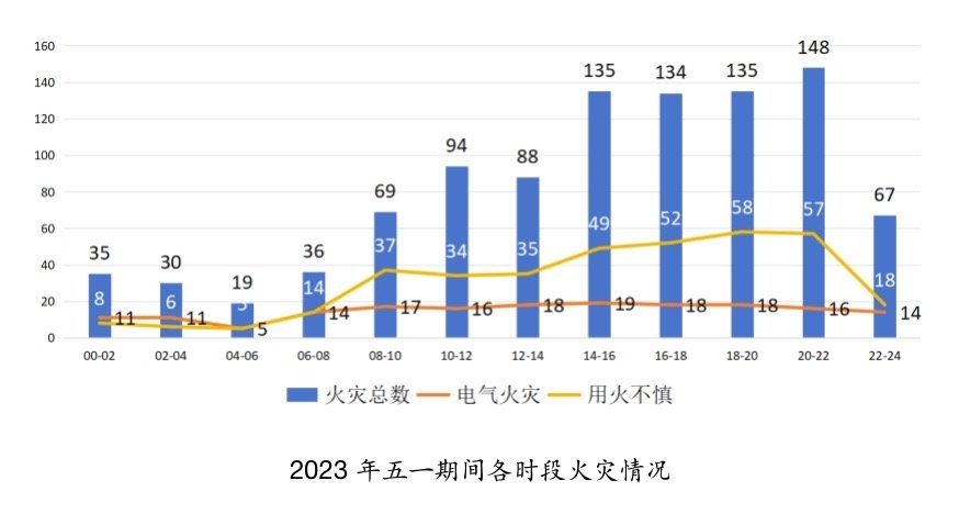 四川省消防救援总队根据过往大数据分析发现,中秋、国庆期间火灾原因主要有两个方面,一是油锅起火、燃气灶具使用以及烘烤等用火不当行为;二是电气火灾,电气线路故障、电气设备故障、蓄电池故障、电动机故障以及电加热器使用不当。主要火灾风险时段为14点—22点,尤其在18点—22点。