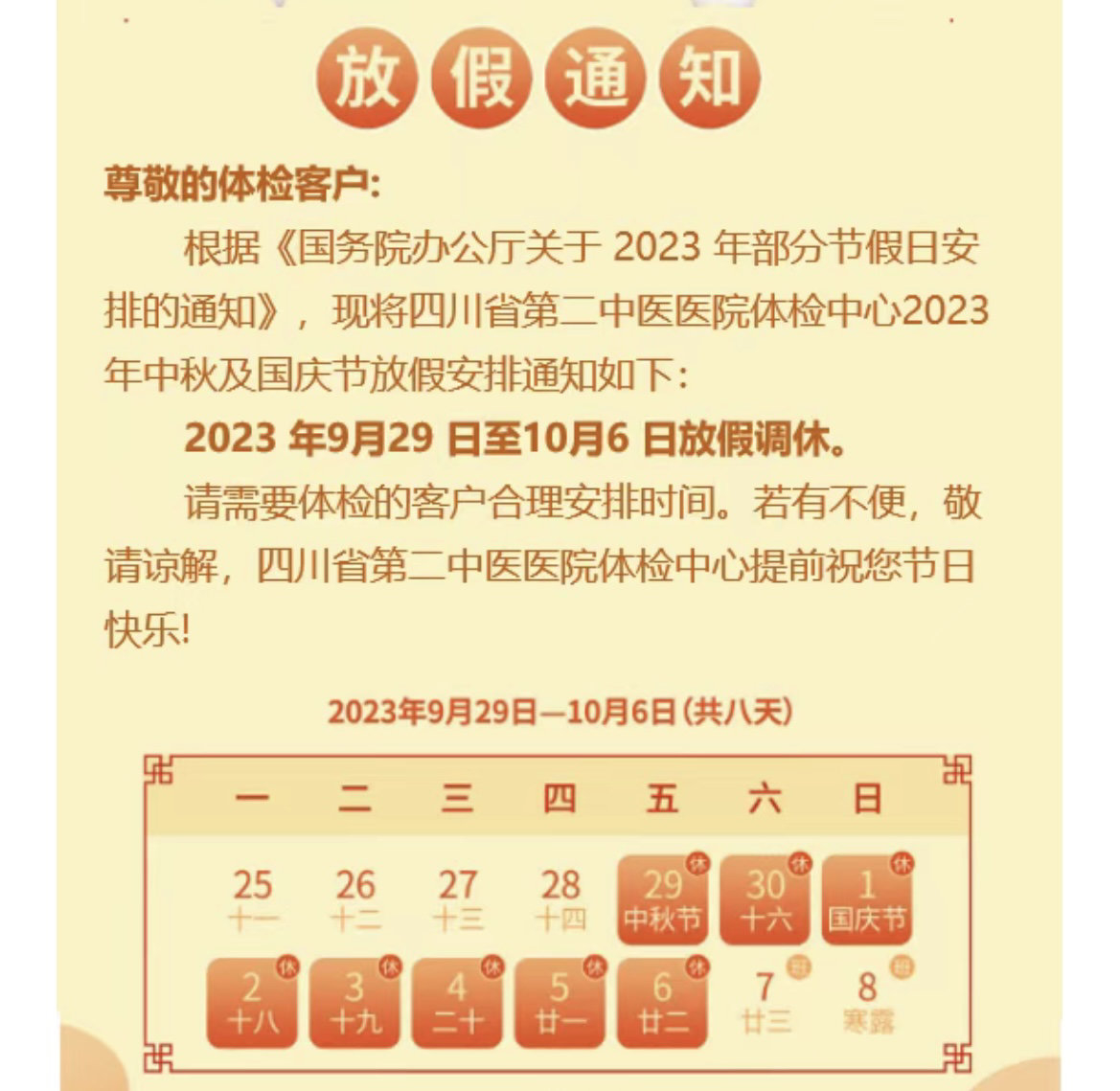体检中心9月29日—10月6日放假8天,10月7日、10月8日正常上班。