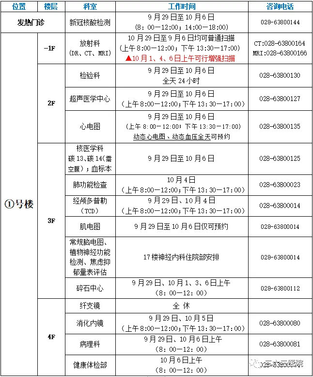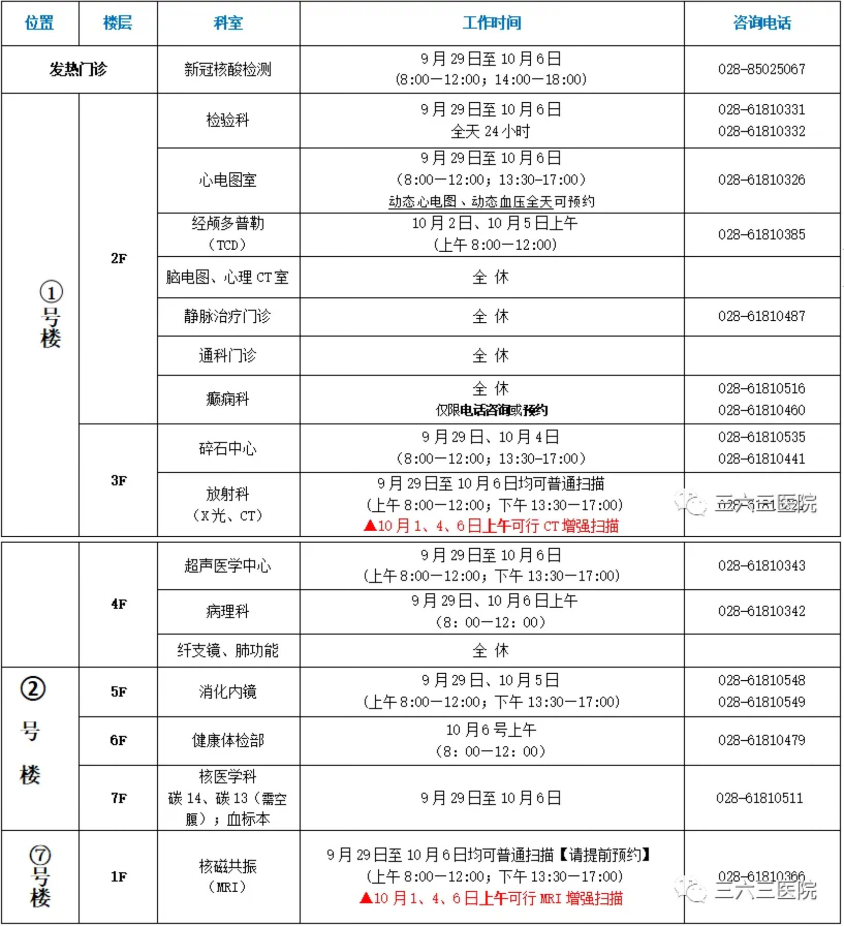 现将犀浦院区(24小时咨询电话:028-63800363)及武侯院区(24小时咨询电话:028-61810363)医技科室、门诊坐诊安排告知如下: