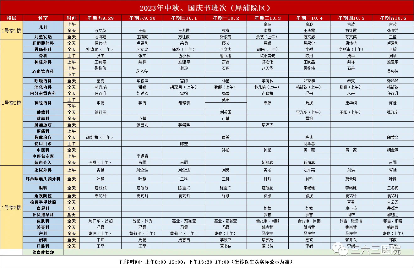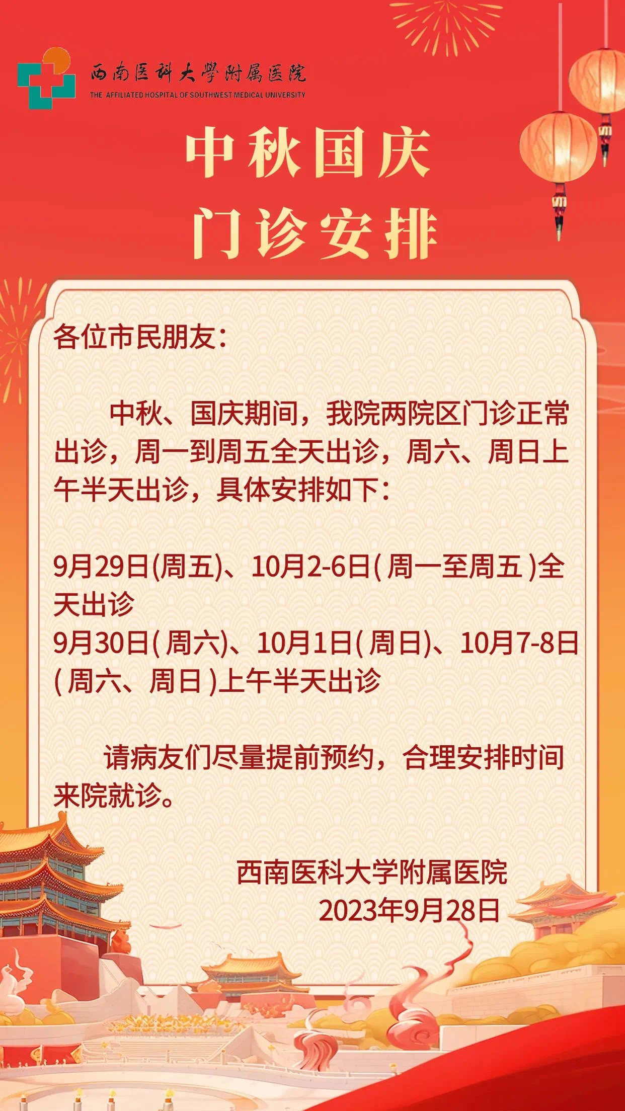 9月29日至10月6日,放中秋国庆假,上午门诊;10月7日,正常上班,全天门诊;10月7日,补10月5日(周四)的班,全天门诊;10月8日,补10月6日(周五)的班,全天门诊。