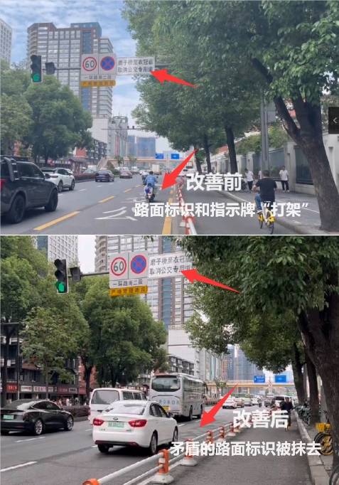 该路段路面标识和指示牌“打架”问题改善前后对比。