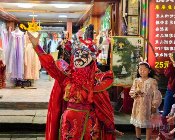 “今天是我第一次在现场欣赏川剧表演,实在是太精彩了。”来自浙江的游客陈文华表示,“我们一家四口来雅安过中秋,没想到能在古镇近距离看到变脸表演,氛围感十足!”