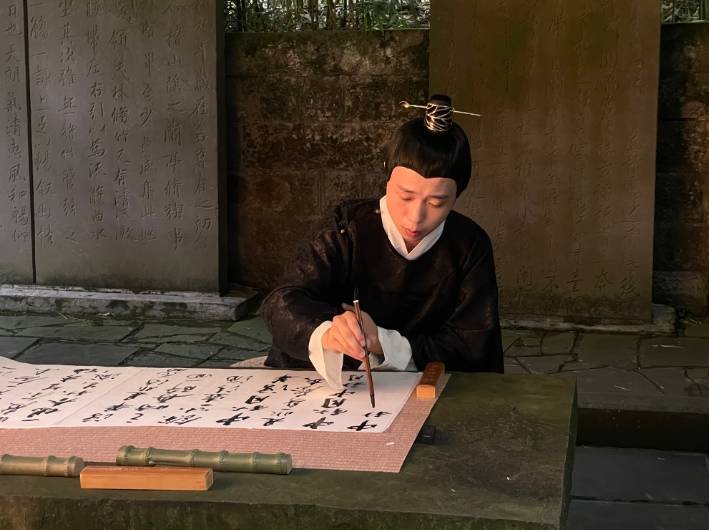录制当天,王浪记得宜宾很热,有36℃以上,他刚穿上长袍古装就出了一身大汗。“第一次当演员,第一次写书法的时候有那么多人围观,还有好几台摄像机在录制,我紧张得手都有点抖,衣服后背都被汗水打湿了。”王浪笑着说,摄影棚内黑黑的,营造出皓月当空的夜晚,流杯池旁一张长案几,他端坐于案几前,一笔一划地写着,一遍又一遍,按着导演的指示调整姿势和动作。写着写着,他慢慢就不紧张了,似乎回到了平时练字的状态,笔尖生韵,翰墨飘香。整个录制持续了一个多小时,王浪顺利地完成了人生第一次表演。