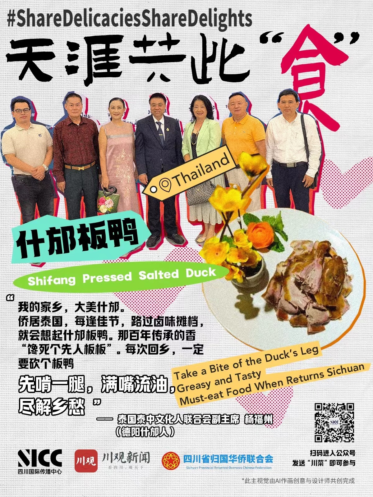 The poster features a photo of Yang Fuzhou reuniting with friends and family in Thailand. Talking about his favorite Sichuan dish, he said, “I was born in Shifang, Sichuan, and now live in Thailand. Every time I pass by the stewed food stall, the smell reminds me of Shifang pressed salty duck. I have to taste it whenever I return home.”