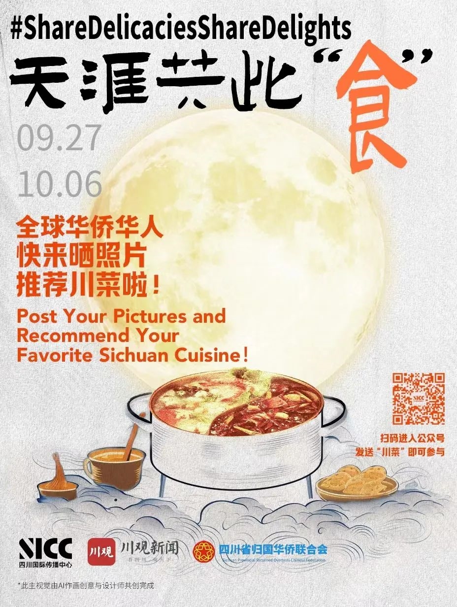 Scan the QR code on the poster to access Sichuan International Communication Center's official account, and send "川菜" (Sichuan cuisine) to participate in the submission: leave a message with a photo of your gathering with family and friends during the Double Festivals period, write about the Sichuan dish you want to recommend and tell the reason. Don’t forget to leave your contact information. We will select high-quality content to create AI creative posters, which will be posted on Sichuan International Communication Center's domestic and overseas social media platforms and Chuanguan News APP. Those with high interaction may have the chance to receive small gifts as part of the event!