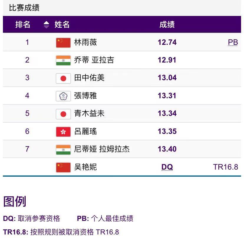 在所有选手中,比她更快的也只有队友林雨薇,后者在顺风2米/秒的情况下,跑出12秒79的个人最好成绩。