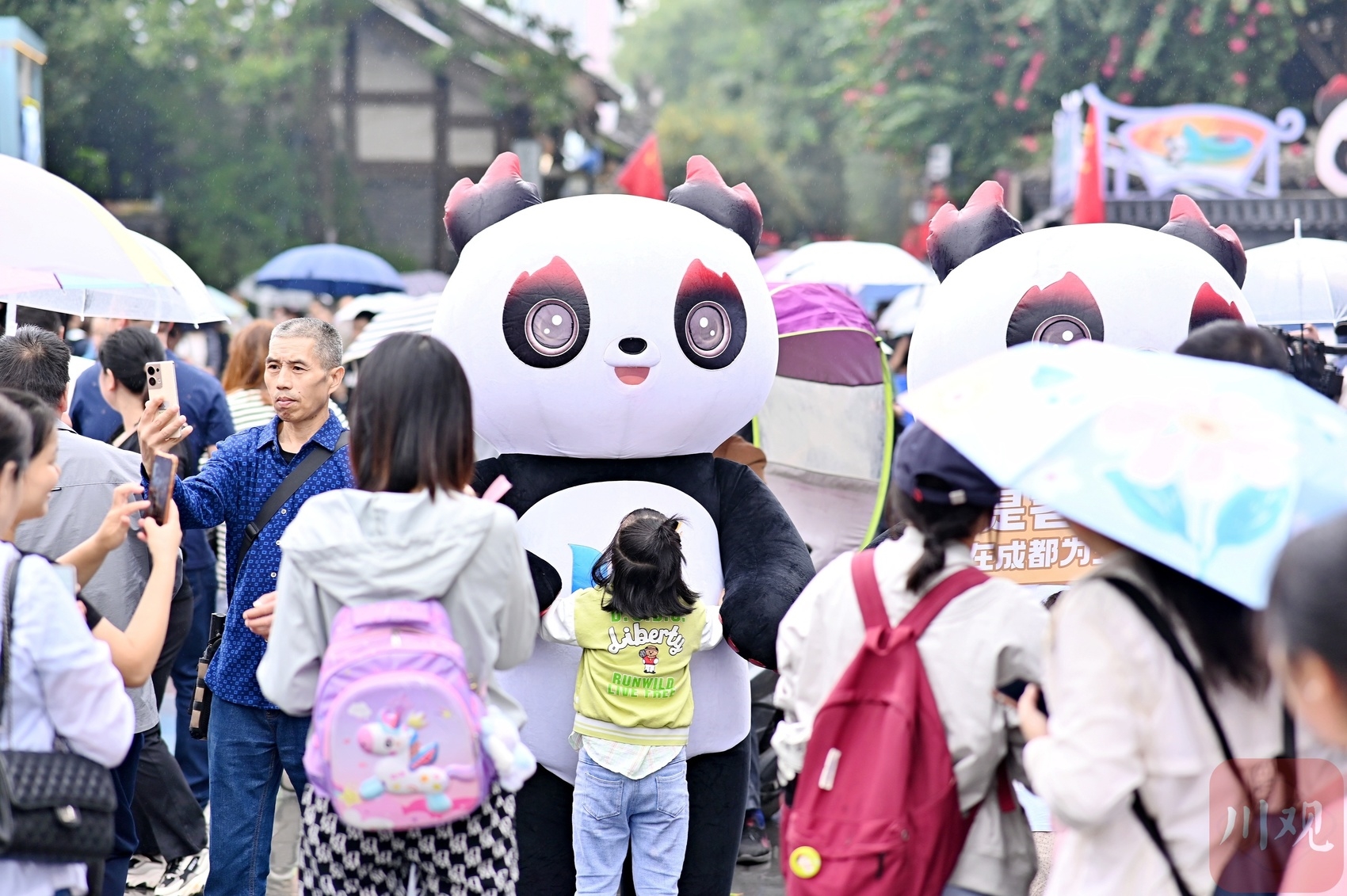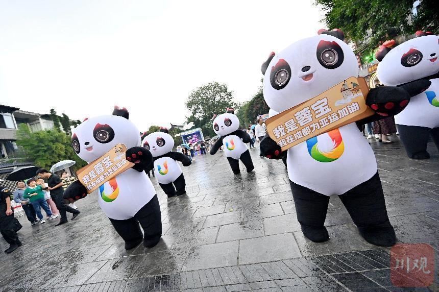 国庆假期,成都各景区迎来游客出游高峰。10月1日,在宽窄巷子景区,大运会顶流“蓉宝”与游客欢快共舞,一起唱响《成都》、《我和我的祖国》、《亚洲雄风》等歌曲。而在另一头,还有两只可爱的“蓉宝”举出了为杭州亚运会加油的牌子,“我是‘蓉宝’,我在成都为亚运会加油!”深情的歌声飘荡在街区,涌动的情怀荡漾在心中。现场气氛感染了所有的观众,市民和游客齐声喊出“祝福祖国更加繁荣昌盛,为杭州亚运会加油!”