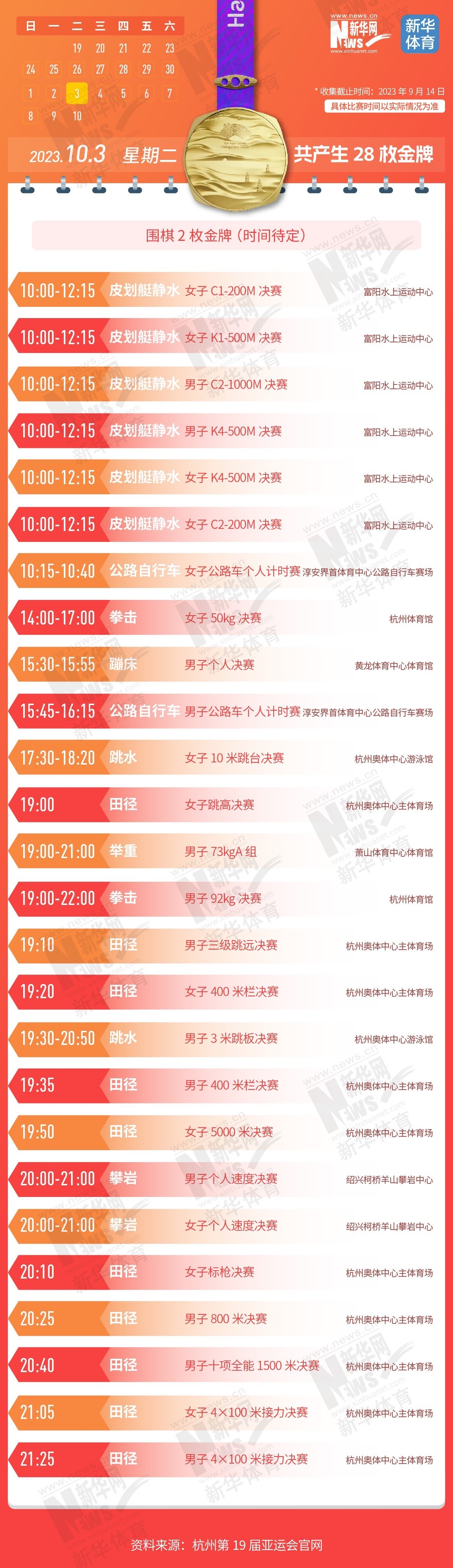 10月3日,杭州亚运会迎来第10个比赛日,将在皮划艇静水、公路自行车、拳击、蹦床、跳水、田径、举重等9个分项上产生28枚金牌。
