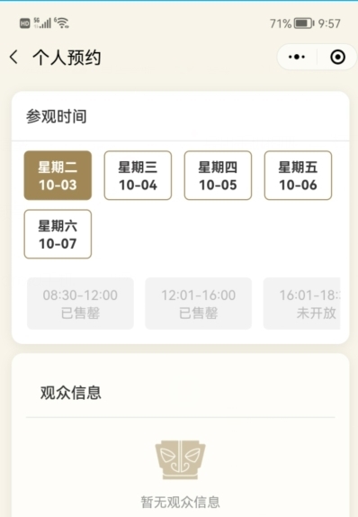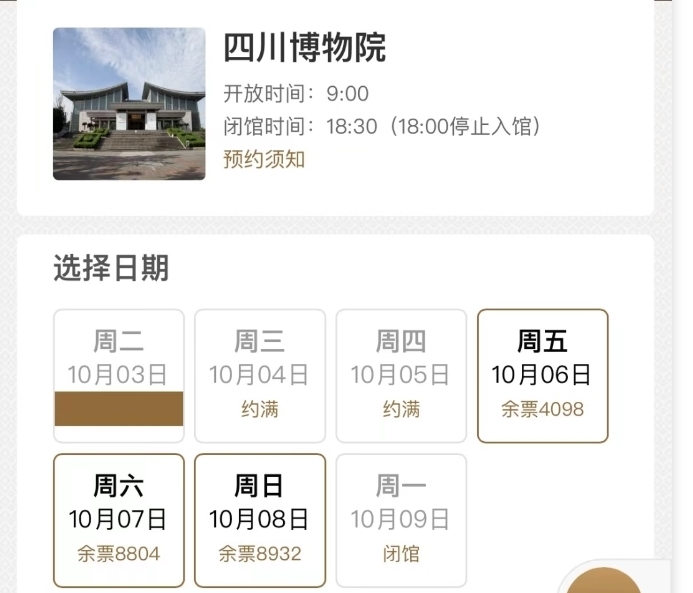 据成都博物馆门票预约页面显示,10月3日—5日门票余票均为0。中秋、国庆期间开馆时间为9:00—21:00,实行分时限流,每日限流20000人。