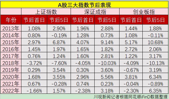 A股三大指数近十年节后表现情况