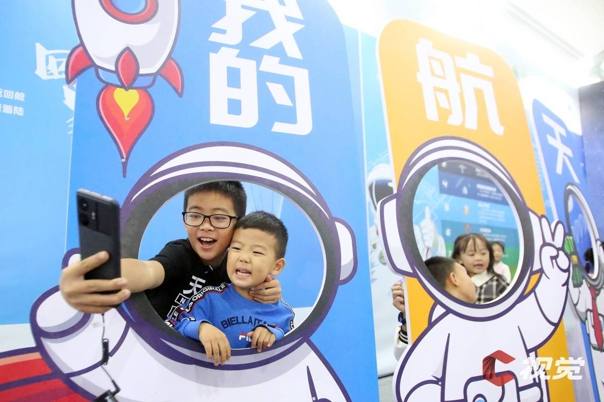 10月5日,孩子们在中国(绵阳)科技城的2023中国科技城航空航天国防科技展打卡。 C视觉摄影师 陈冬冬 摄