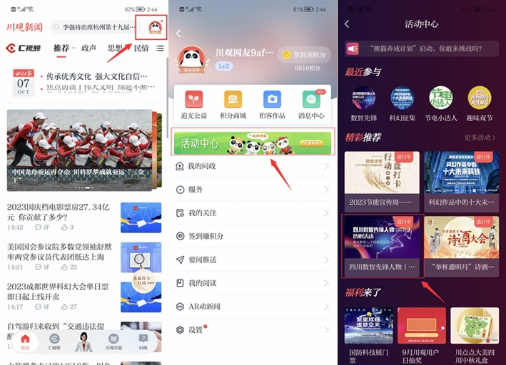 符合选树条件的人员,可于2023年10月7日至10月31日登录“四川数智先锋人物(2023)”选树活动网址(https://topic.scol.com.cn/2023/23szxfrbm)或下载川观新闻客户端进入“活动中心”,选择“四川数智先锋人物(2023)报名”(见下图),按要求如实、准确、规范填录申报信息、上传证明材料。“四川数智先锋人物(2023)”选树将按照资格审核、专家初选、网络评议、评委会终选、组委会审定、结果发布的程序进行。