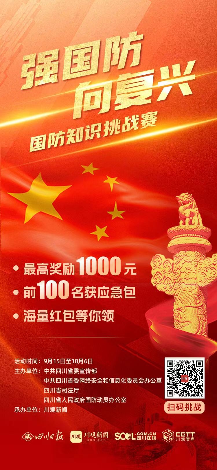 国庆长假结束,由中共四川省委宣传部、中共四川省委网络安全和信息化委员会办公室、四川省司法厅、四川省人民政府国防动员办公室联合主办,川观新闻承办的“强国防 向复兴”国防知识挑战赛也顺利收官。