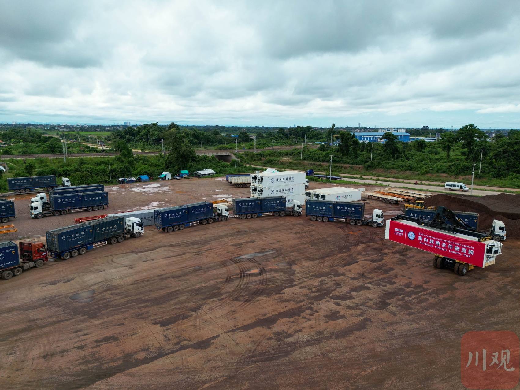 万象南站,中老铁路的终点,车站周边大型货车来来往往。驱车来到距车站不到2公里的四川西部陆海新通道老挝(万象)物贸集散中心,从主干道进入集散中心堆场,短短数百米路,迎面就遇到3辆载着集装箱的货车驶出。