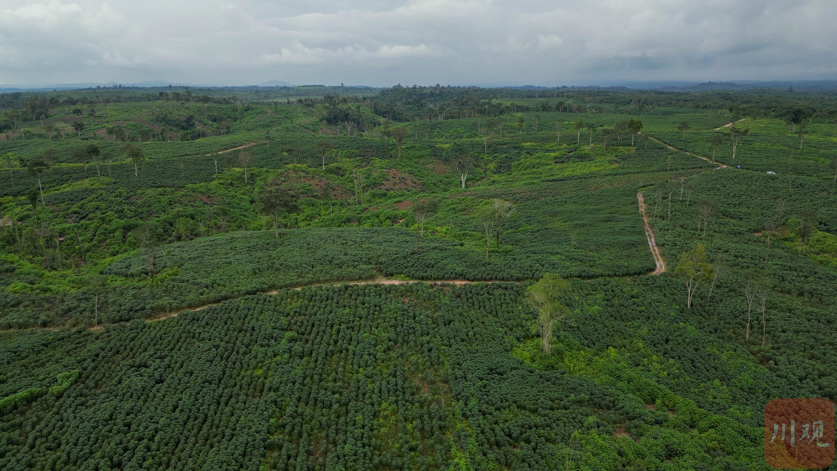 眼前的木薯园,植株比人还高,入口处竖立着“四川省泛亚集团老挝木薯种植基地”的蓝色牌子,以中、老、英三种文字书写。木薯亭亭玉立,向上伸展着墨绿色的枝丫,像一只只张开的巨掌。无人机升空,视野所及,皆是木薯,犹如铺了一层厚实的绿毯。