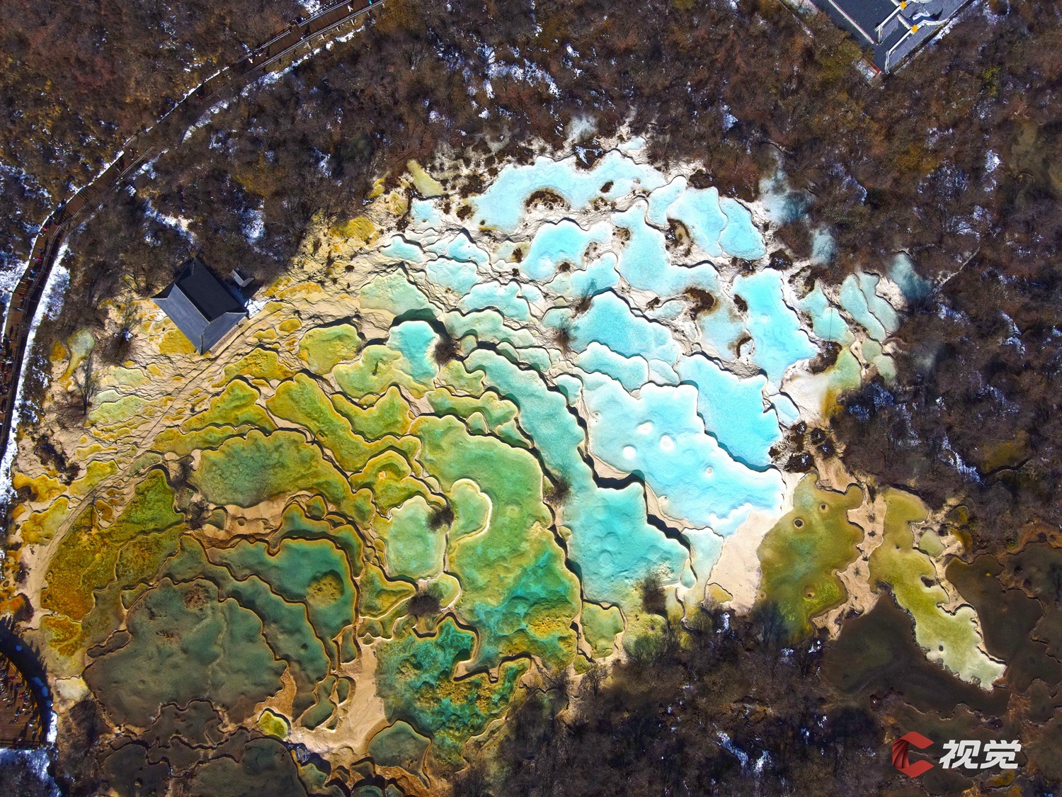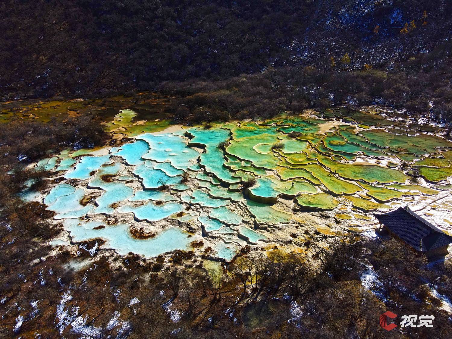 金秋时节的黄龙景区,图为五彩池全貌。
