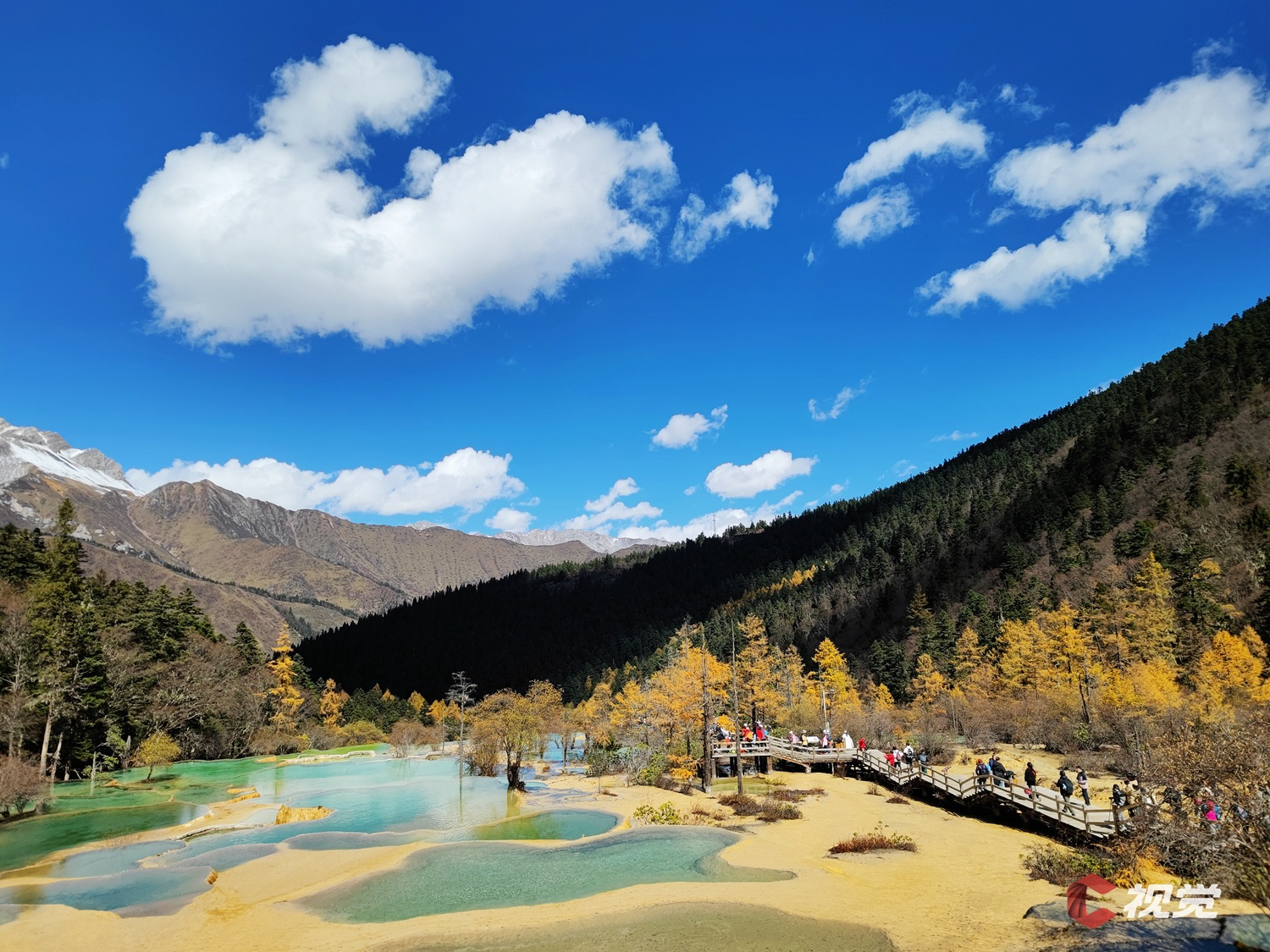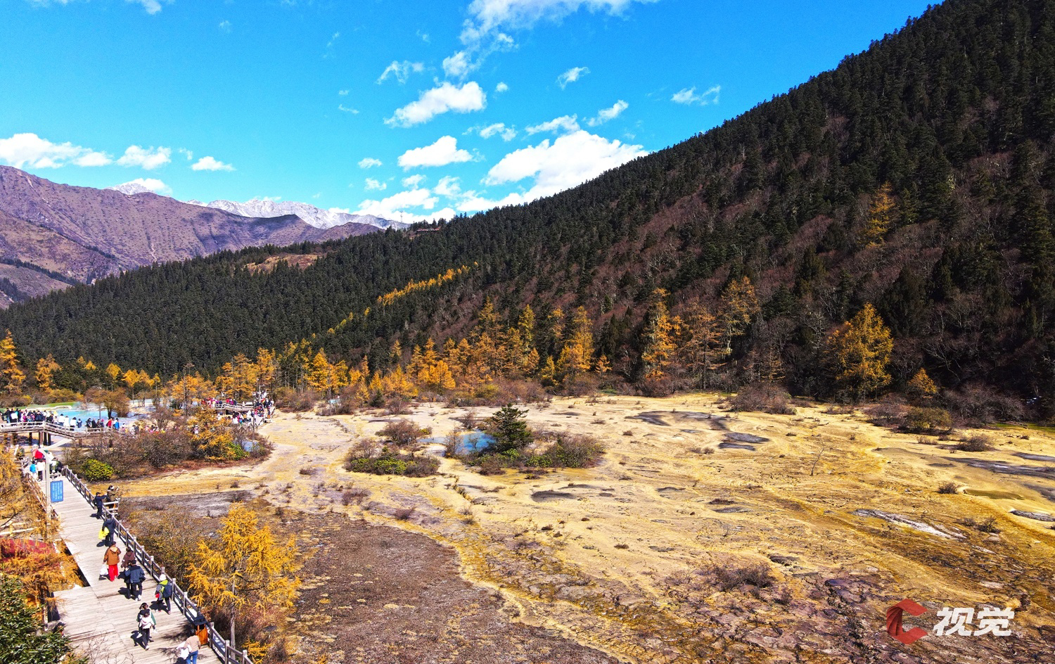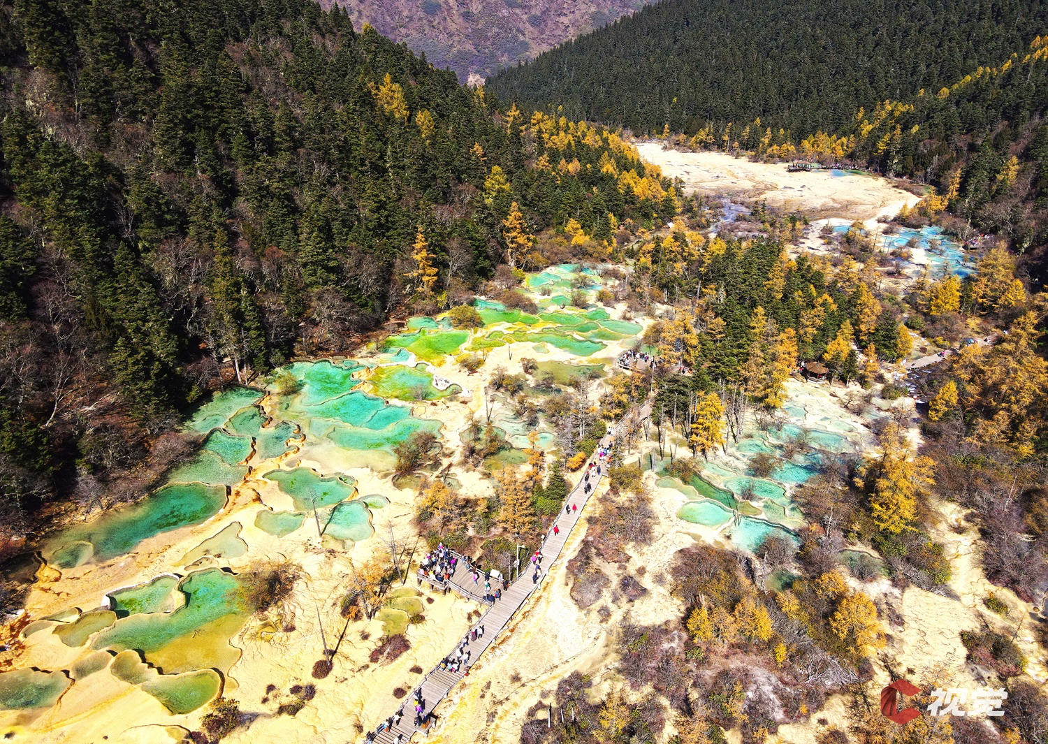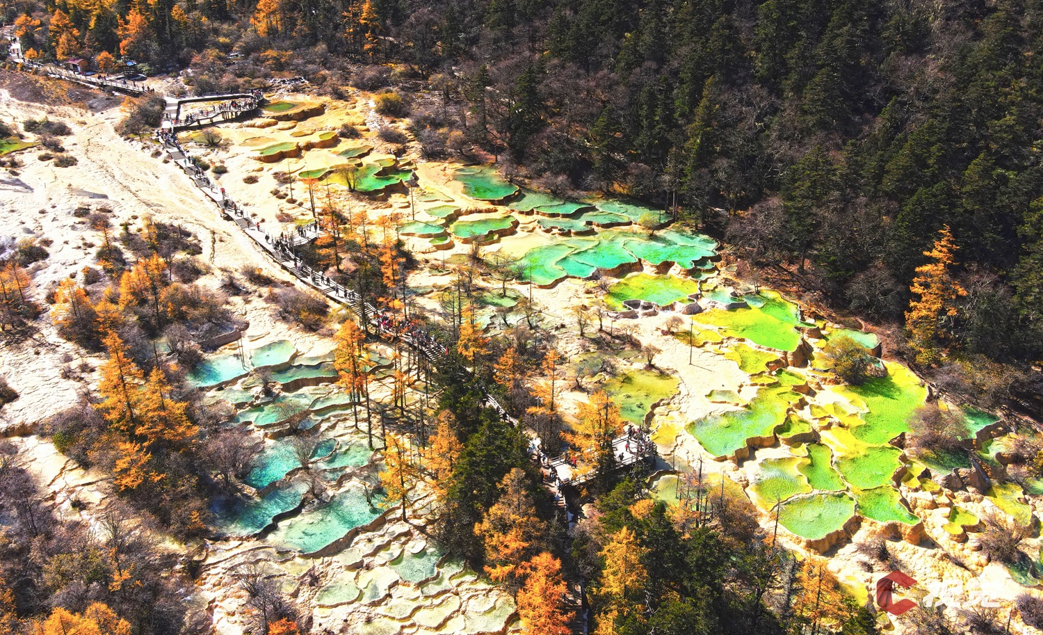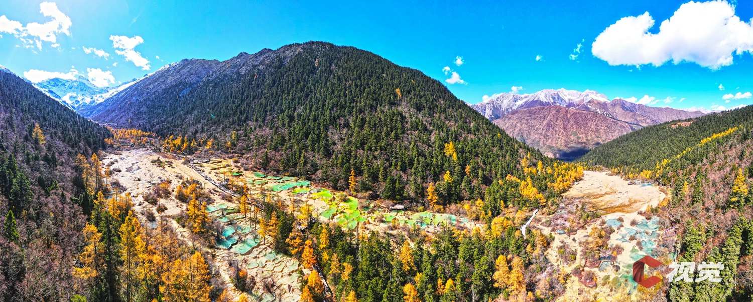 10月23日,位于阿坝州松潘县的黄龙景区秋意盎然,金色的彩林环抱着五彩缤纷的钙化池,或碧绿、或湛蓝的池水在阳光的照耀下更加炫彩夺目。