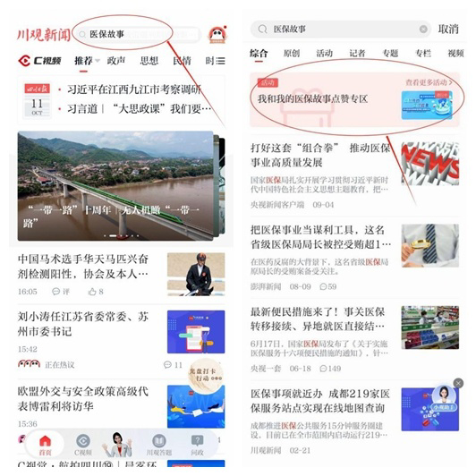在川观新闻首页搜索框,输入“医保故事”进行搜索,找到“我和我的医保故事”点赞专区活动图片,点击进行活动点赞。