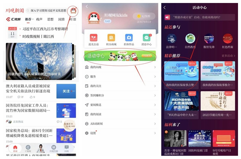 在川观新闻首页,“我的”版块,点击“活动中心”,找到“我和我的医保故事”点赞专区活动图片,点击进行活动点赞。