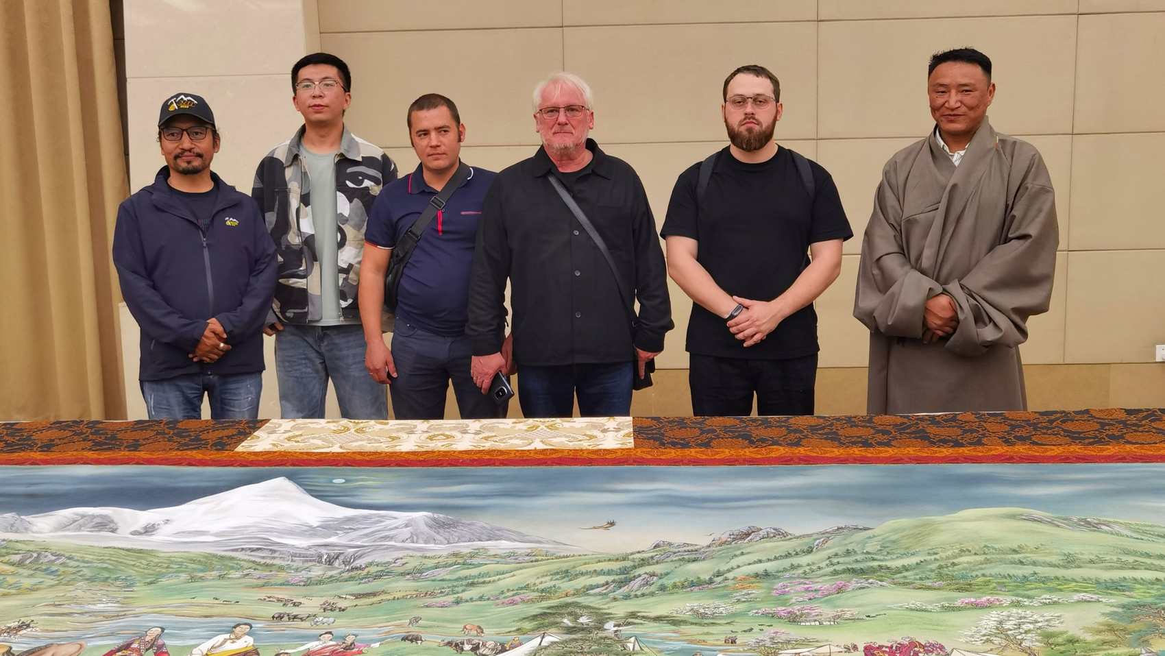 呷绒翁都(右)与俄罗斯列宾美术学院画家等在《香巴拉画卷》前合影(四川在线记者 田为 摄)
