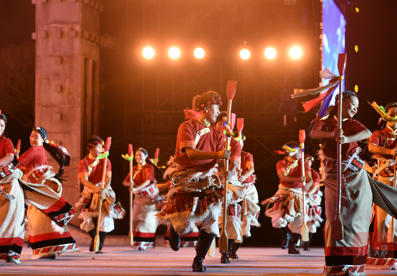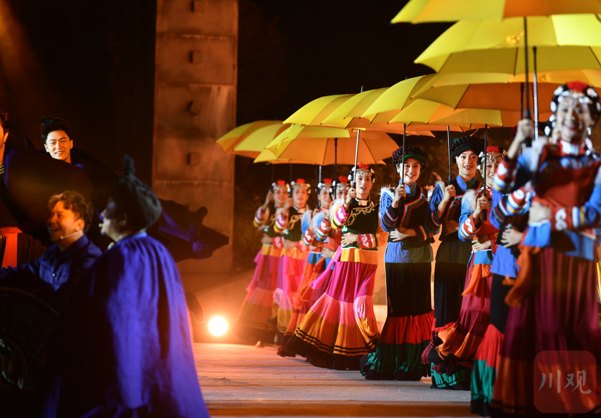 麦穗包裹的舞台,矗立于剑门关外。当夜色降临,人们随着“暮从碧山下,山月随人归”的诗意,回溯蜀乡古韵。这古韵从历史文化而来,作为“中国石刻艺术之乡”,资阳安岳石刻具有“古、多、精、美”的特点,可谓“上承敦煌,下启大足”。资阳市安岳县石羊镇的村民们载歌载舞,用《石乡古韵》展现石刻匠人挥毫巴山蜀水间,创造出形象生动的石窟艺术。《盈盈陶上轻》以汉唐古典女子群舞的形式,展现陶罐上的精美图案,将底蕴深厚的内江隆昌石燕桥镇制陶史娓娓演绎。