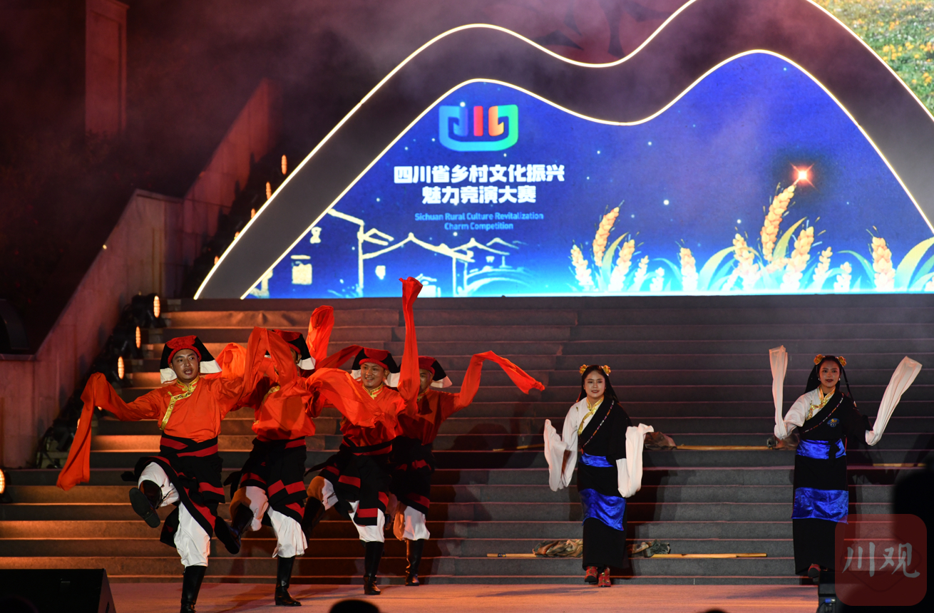 来自阿坝州阿坝县阿坝镇的村民手持木棒,上下挥舞,配合脚下舞步变化,一幅藏族人修建房奋力夯土墙的画卷徐徐展开。热烈幸福的气息,彰显了今日安居乐业的蜀乡新貌。宜宾市翠屏区思坡镇《品味思坡》以镇域文旅景点和“酸甜苦辣咸”——思坡“五味”特色农产品为素材,通过本土文化能人的情景表演,将集农文旅与城乡融合发展于一体的思坡镇乡镇魅力展现于台。眉山市东坡区太和镇的原创歌曲《永远丰收》以展现新时代“天府粮仓”的新风貌为创作初心,融入说唱、电音等流行元素,描摹出景美、人美、日子美的农村风貌。