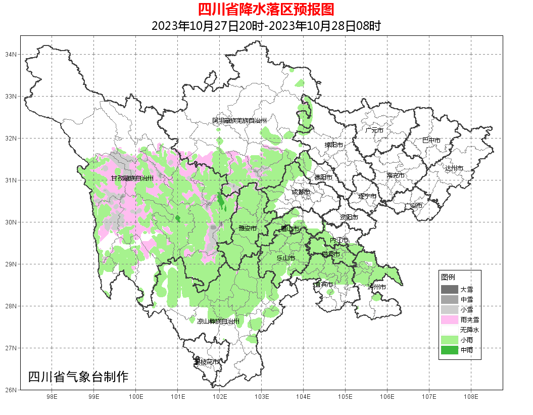 今天晚上,盆地大部阴天间多云,其中雅安、乐山、自贡3市和绵阳、德阳、成都、眉山4市西部及宜宾、泸州2市北部有小雨或阵雨;甘孜州中部南部、阿坝州东部南部及凉山州北部阴天间多云有阵雨(雪),川西高原和攀西地区其余地方多云间晴。